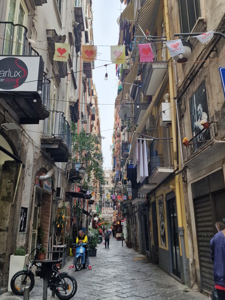 The last area we had time to explore was the Spanish quarter, one of the city’s most densely populated areas. This is probably where Naples gets its reputation for being dirty and full of dodgy characters, but I quite liked wandering the streets and seeing washing hanging from all the balconies, the graffiti and hidden taverns. You do however need eyes in the back of your head as locals literally fly around the streets on their scooters.