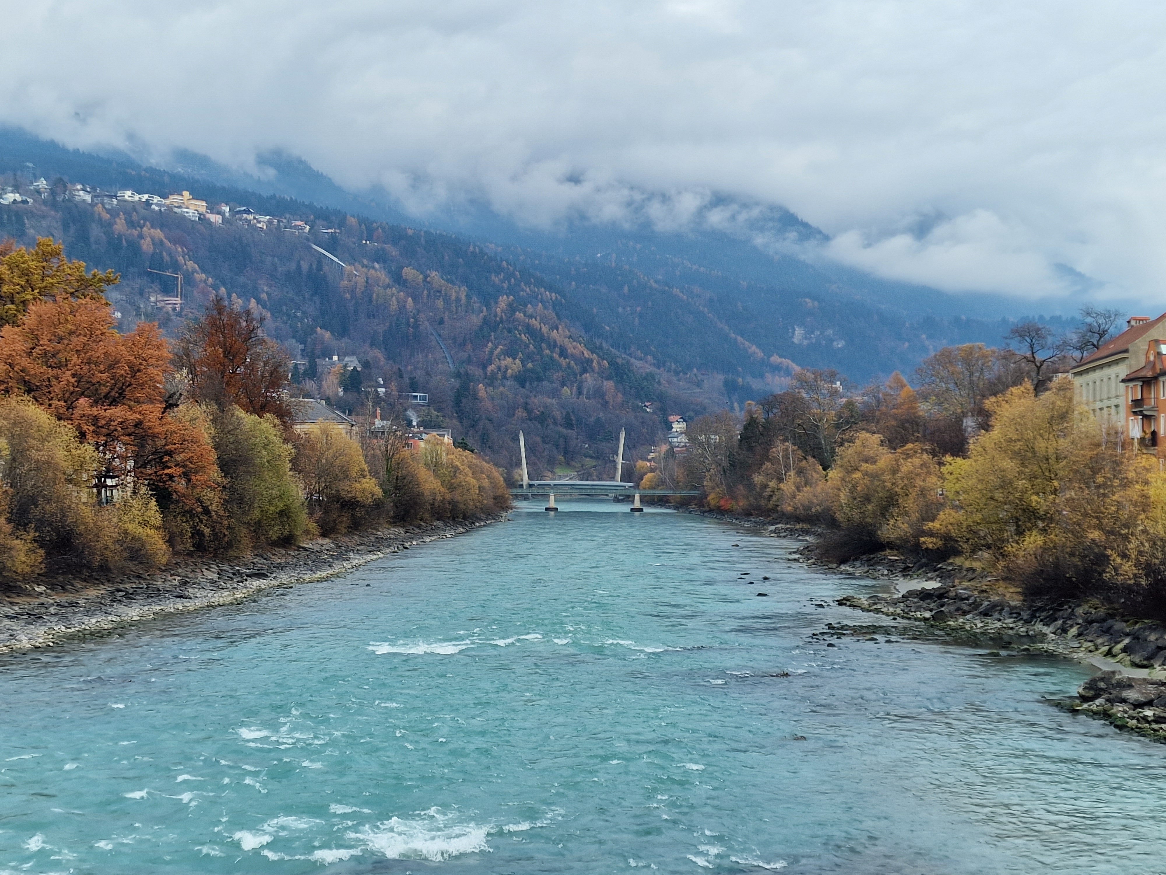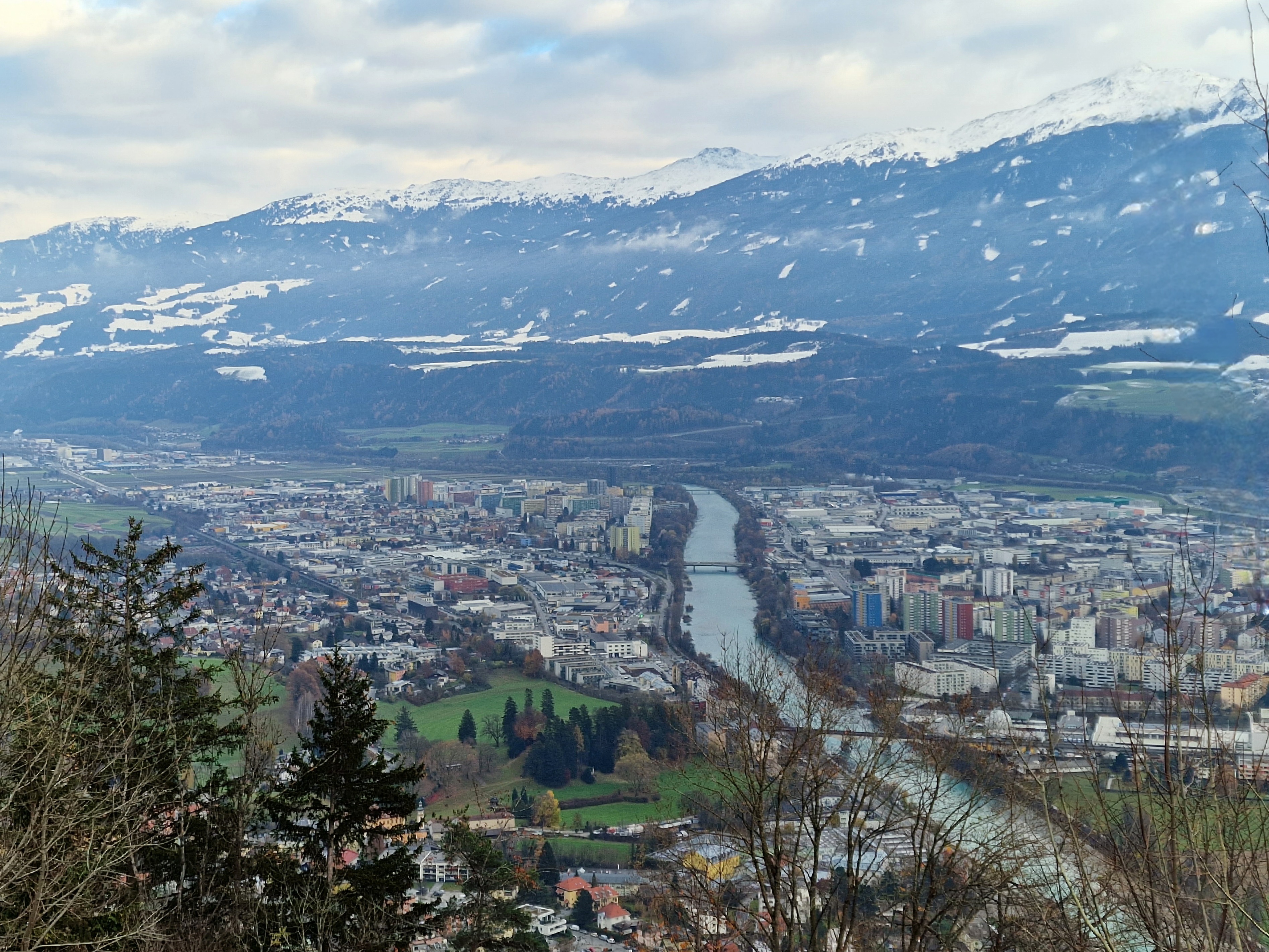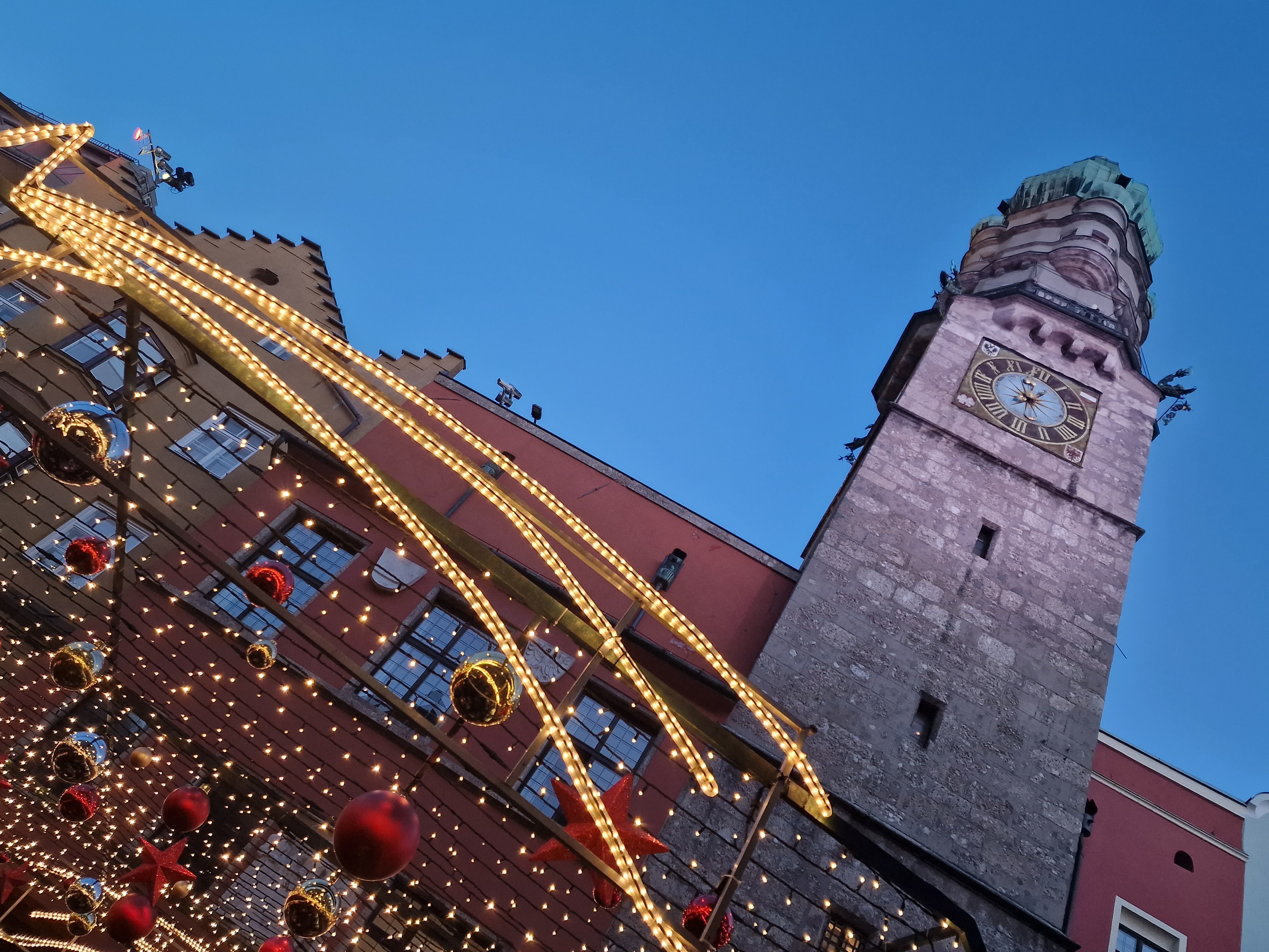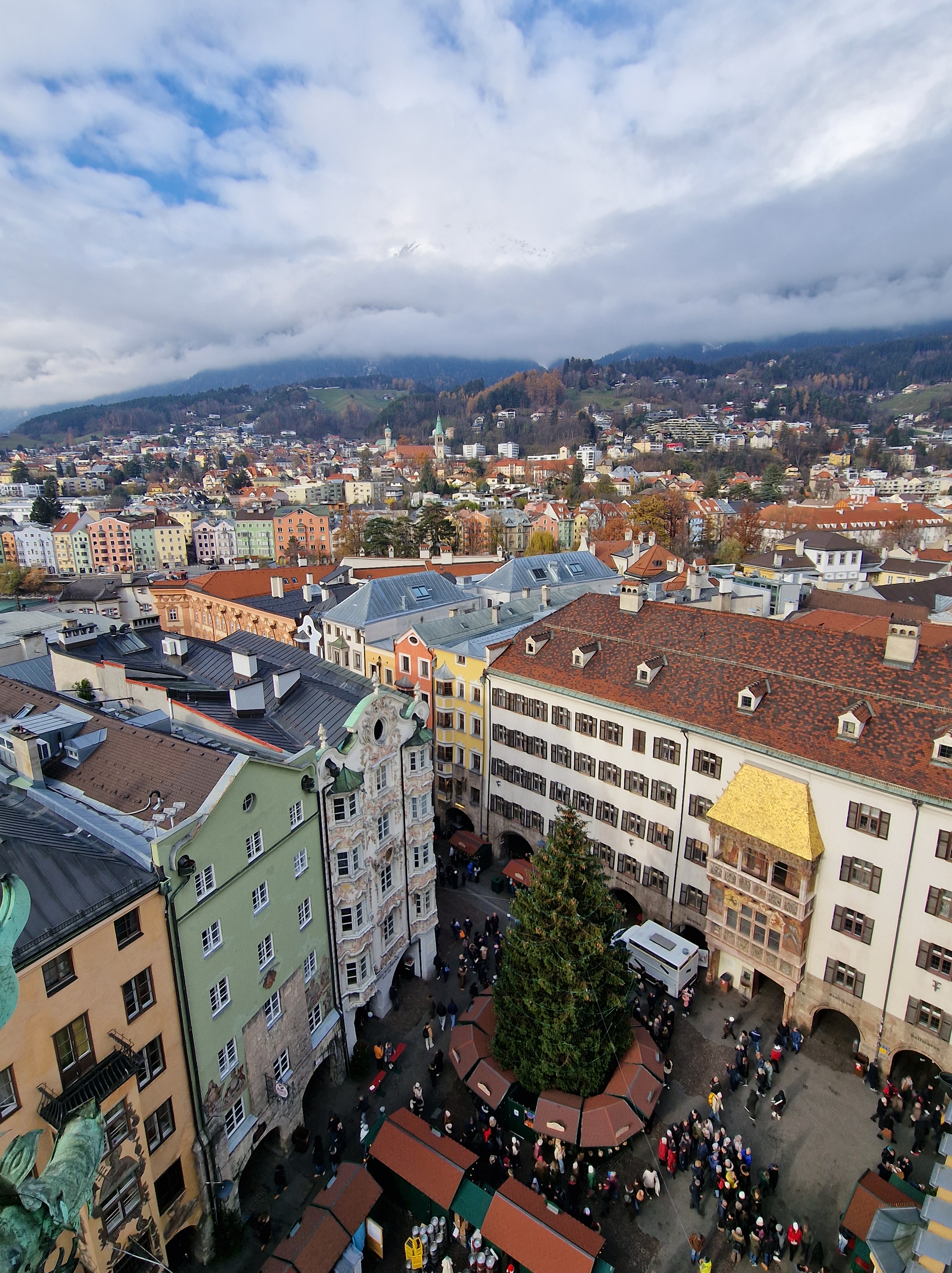 We woke up to thick fog, which is obviously perfect weather conditions when the plan is to go up a mountain 🙄 a quick Google suggested that this would be cleared by midday, so we decided to spend the morning on ground level. We headed for one of Innsbruck’s best known viewpoints – the river, the colourful houses, and the mountains as a backdrop. Along with the autumal trees, it’s an absolutely stunning location in the city. As we love good panoramic view we climbed the City tower (Stadtturm) and as promised by Google, the fog was starting to clear, meaning we got gorgeous views over the roof tops, the snow capped mountains and the hustle and bustle of the Christmas Market below.