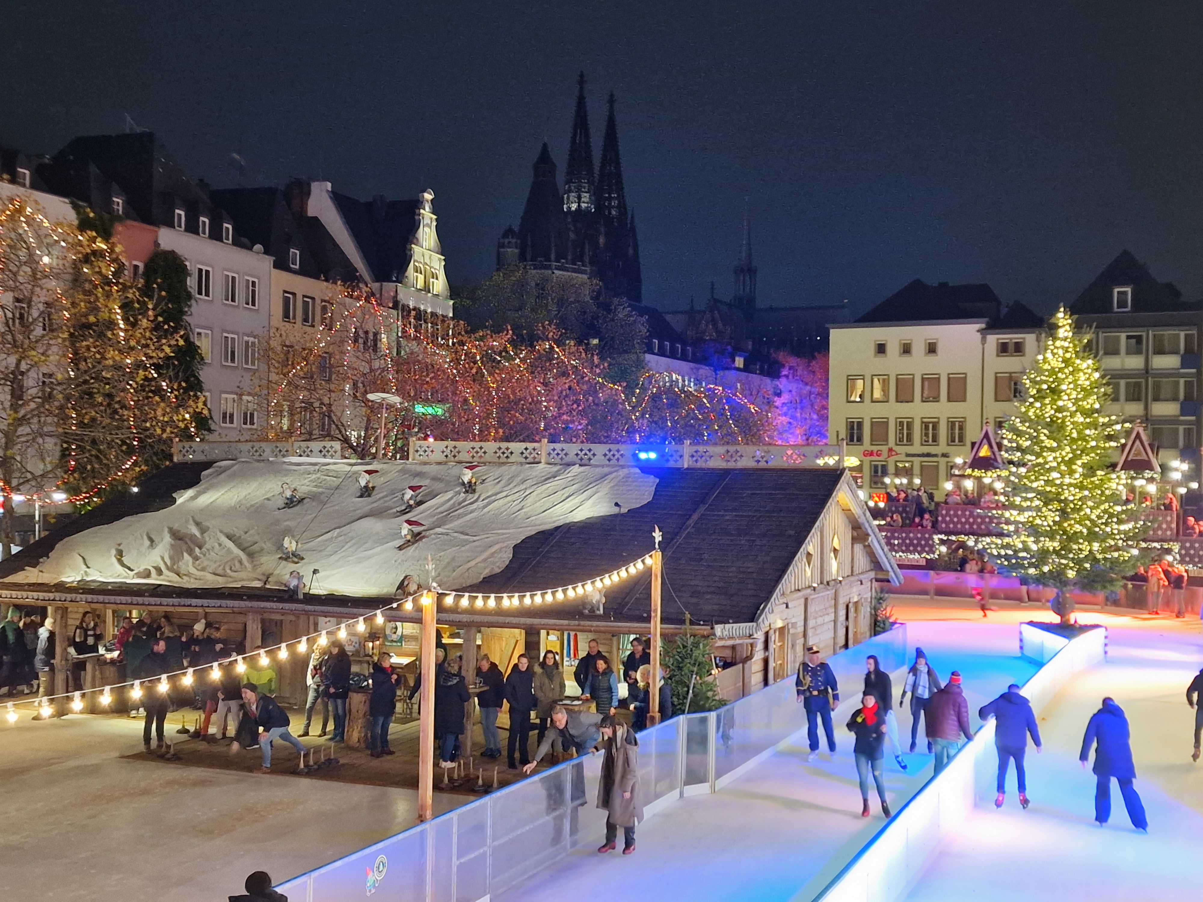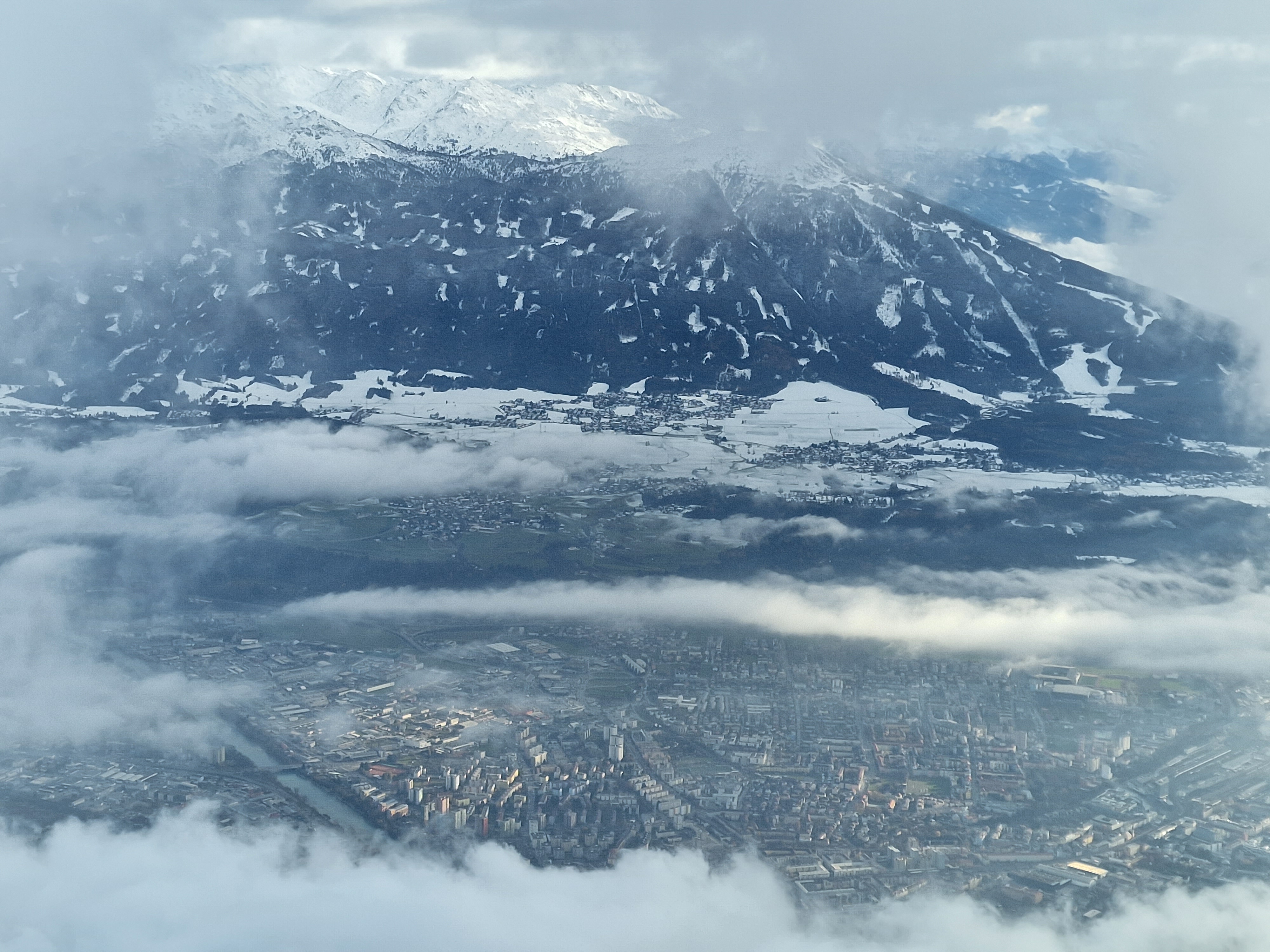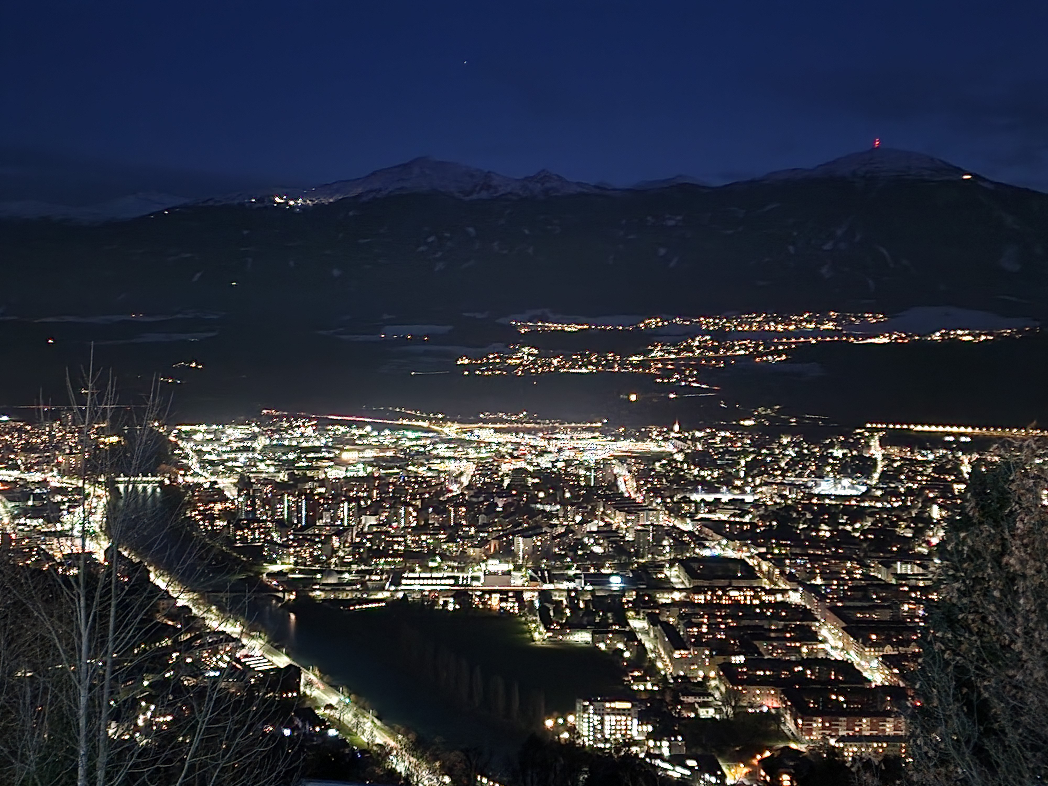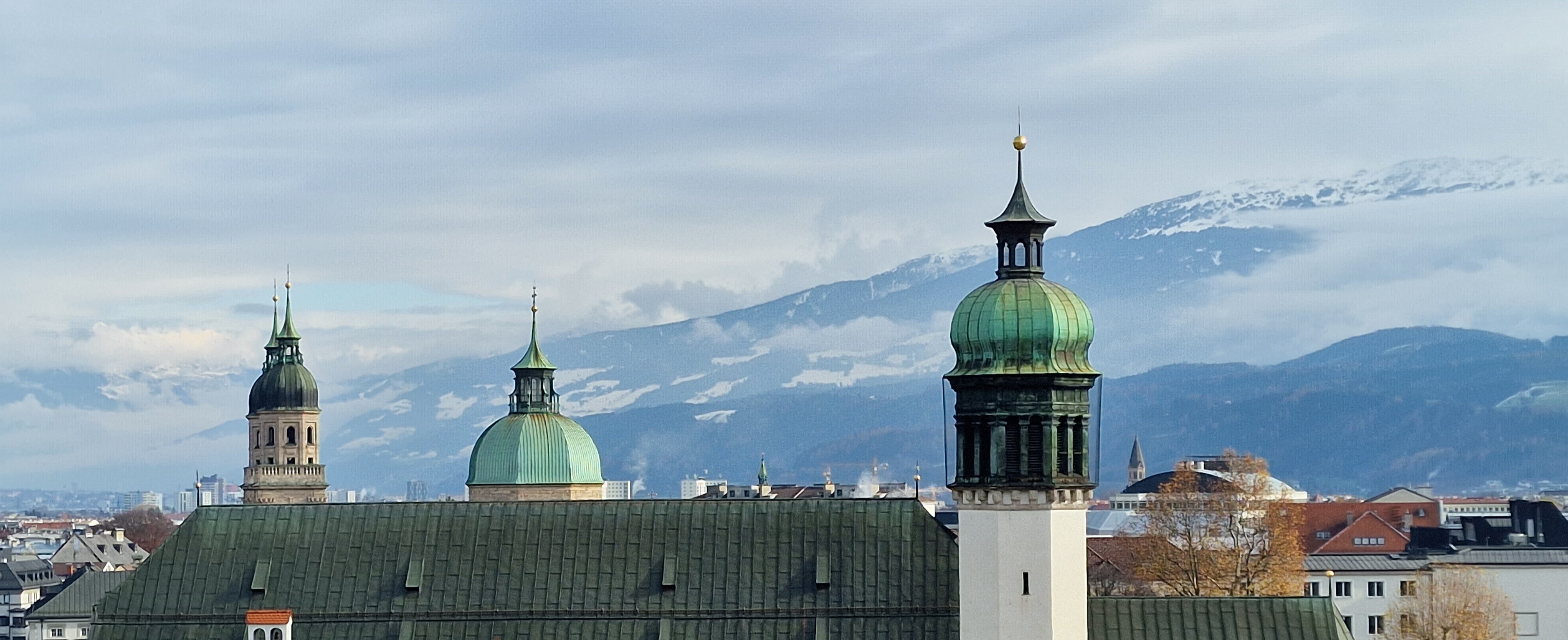 We woke up to thick fog, which is obviously perfect weather conditions when the plan is to go up a mountain 🙄 a quick Google suggested that this would be cleared by midday, so we decided to spend the morning on ground level. We headed for one of Innsbruck’s best known viewpoints – the river, the colourful houses, and the mountains as a backdrop. Along with the autumal trees, it’s an absolutely stunning location in the city. As we love good panoramic view we climbed the City tower (Stadtturm) and as promised by Google, the fog was starting to clear, meaning we got gorgeous views over the roof tops, the snow capped mountains and the hustle and bustle of the Christmas Market below.