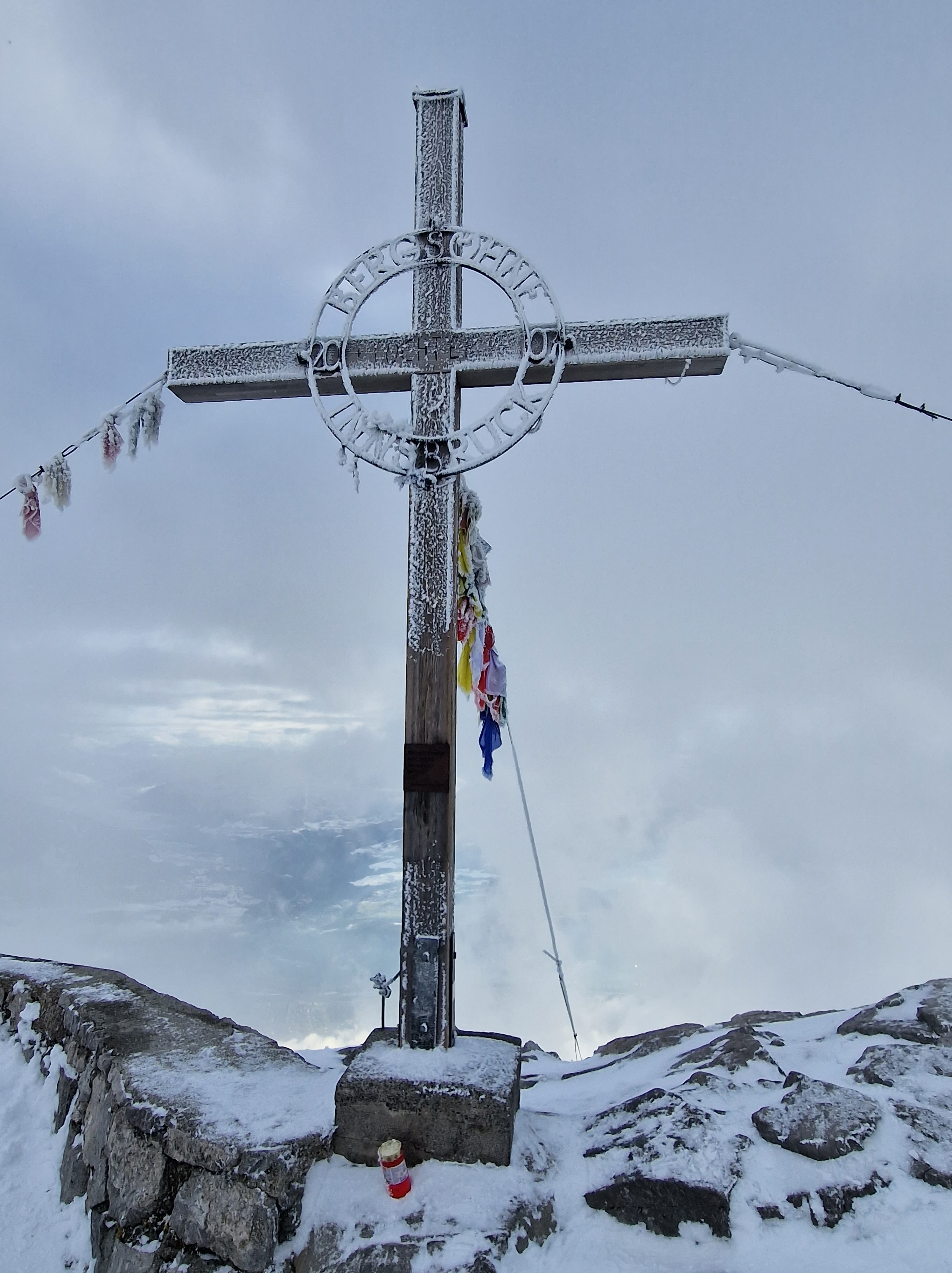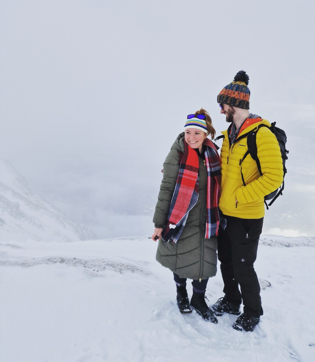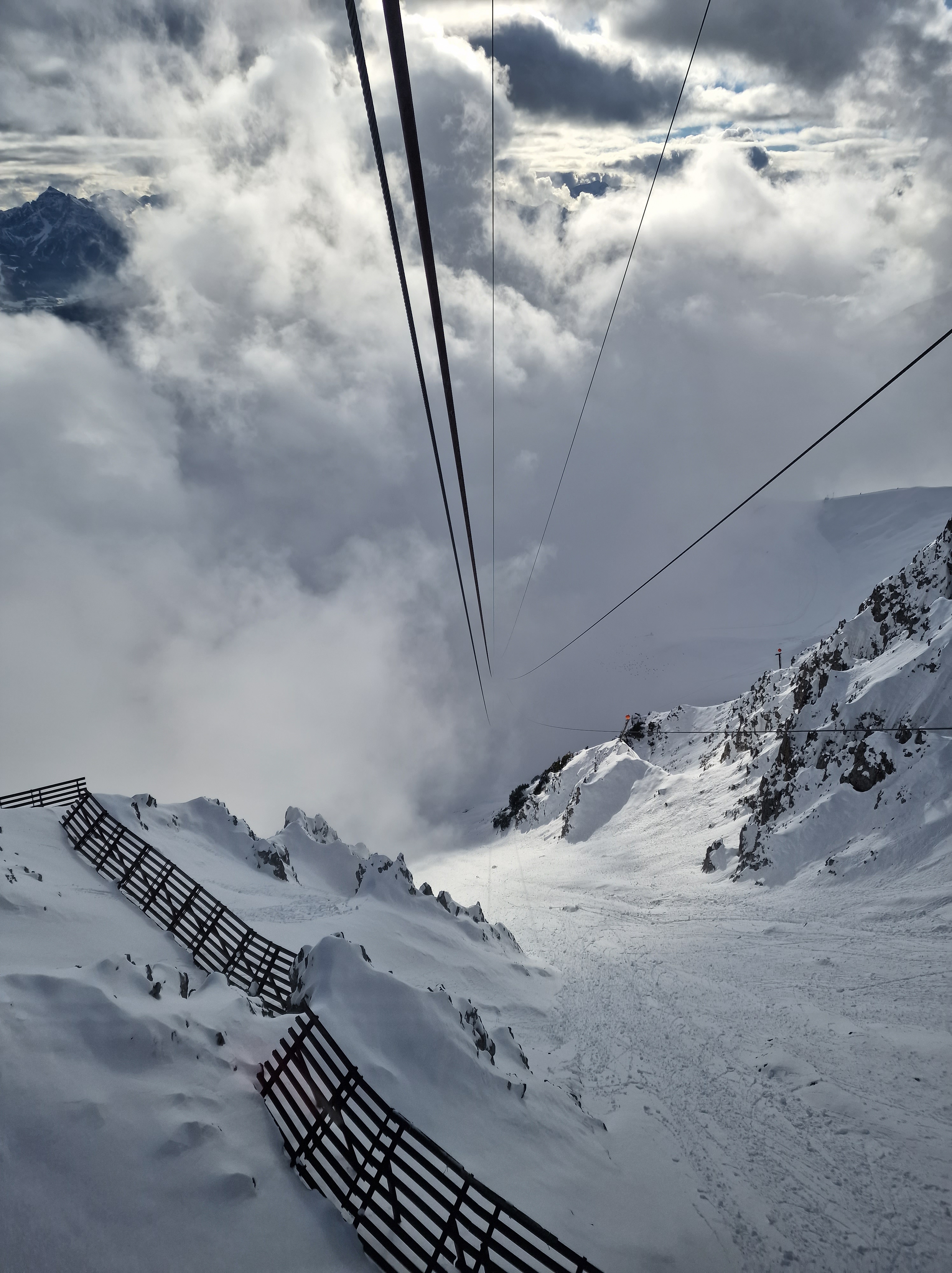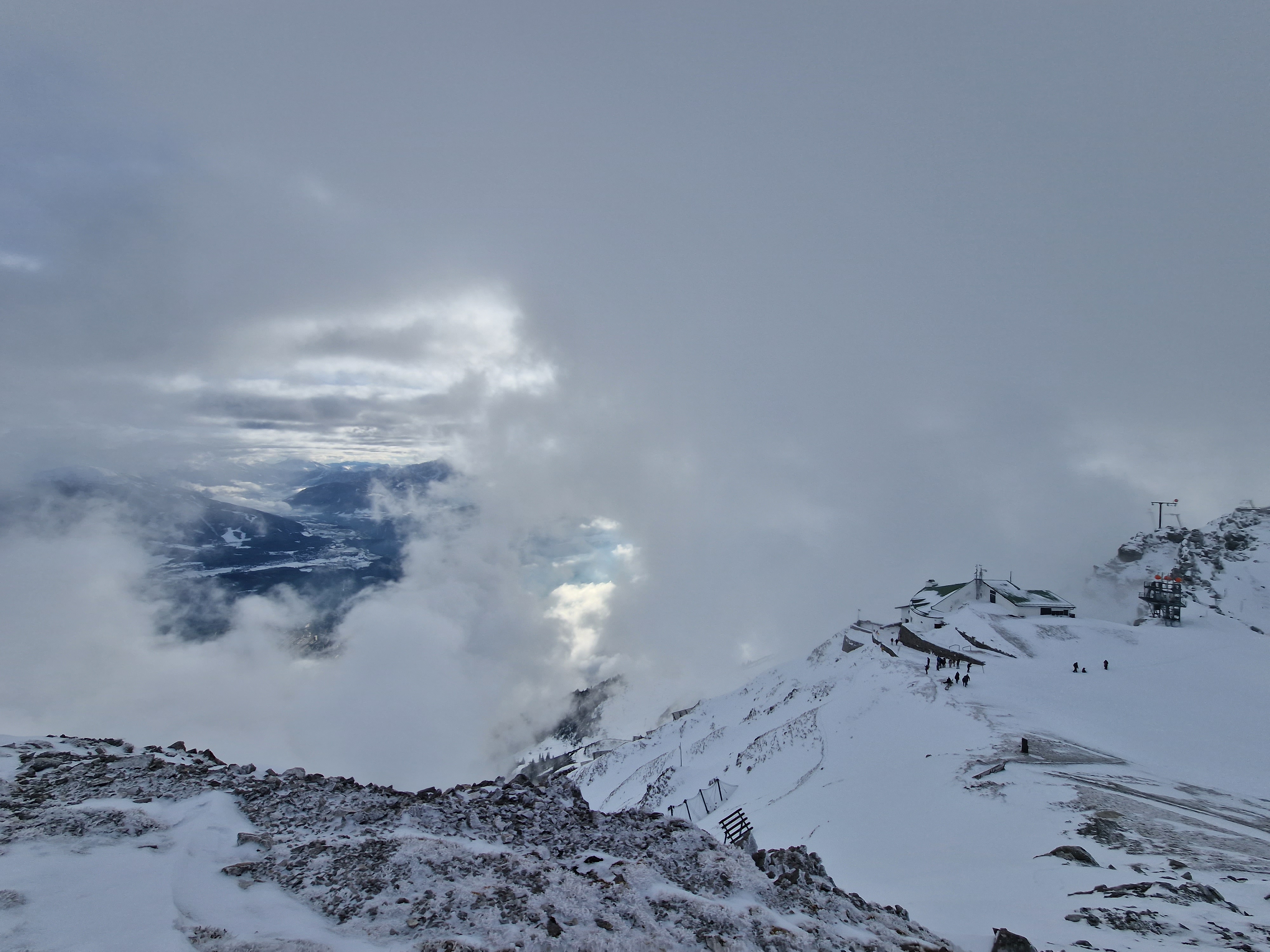 It was time for a change of scenery to what we had been used to, so we boarded the cable car, and in just 20 minutes, you’re away from the crowds and enjoying the snow. It’s been far too long since I was somewhere like this, and it really made me miss skiing (although after everything I’ve eaten, there’s no way any of my ski gear would fit now!) Having neglected to pack my walking boots, I was hoping my Docs would have enough grip to get me to the top of the mountain. This was not the case, and I had to cling on for dear life to Mark as I was slipping all over the place. Not once but twice I went flying, the second time pulling Mark down with me 🤣 we kept getting little glimmers of the land below through occasional breaks in the cloud, but it wasn’t going to be our day to see for miles and miles. This didn’t matter as it was still magical to be up there and feel the cold wind biting at your face.