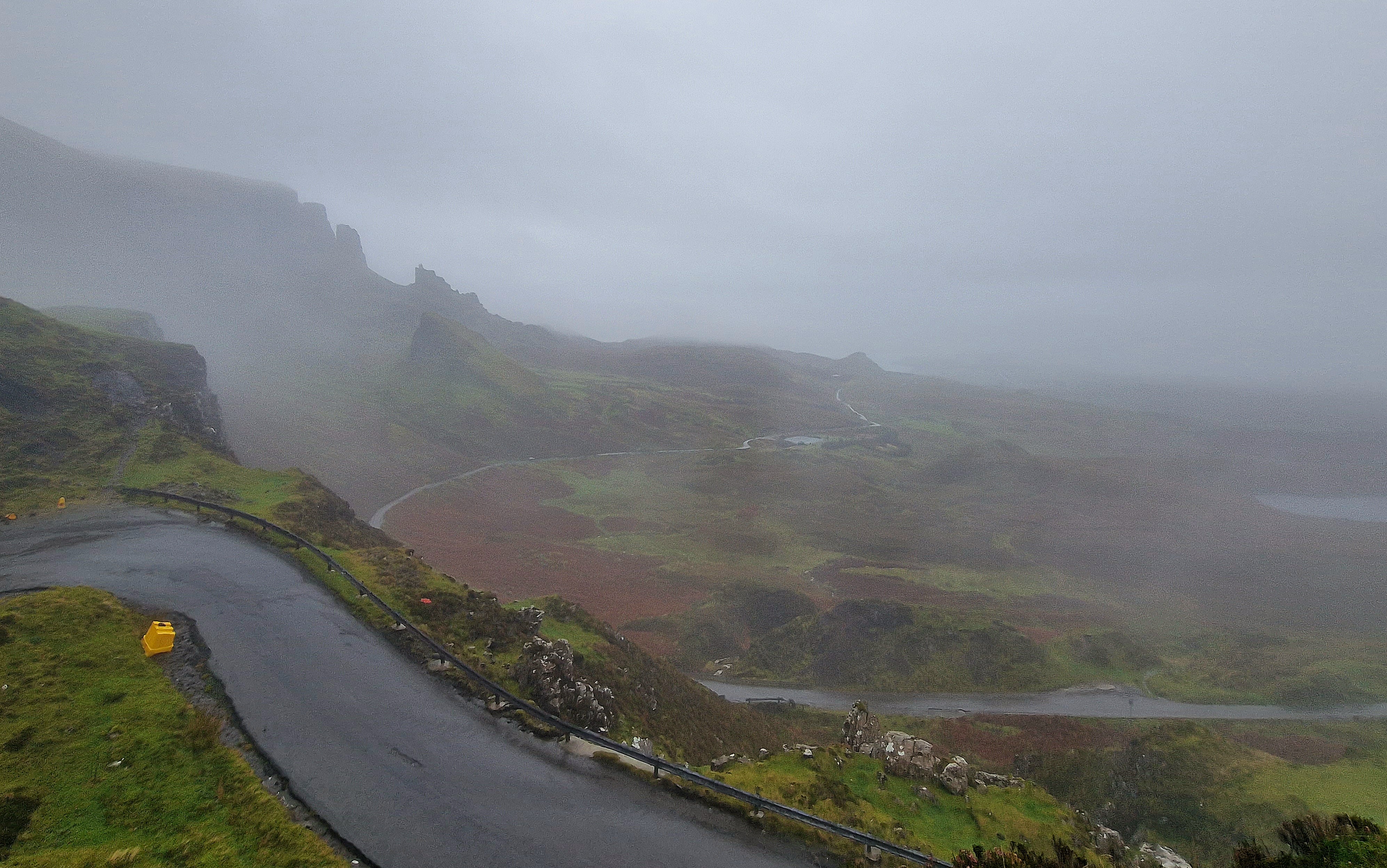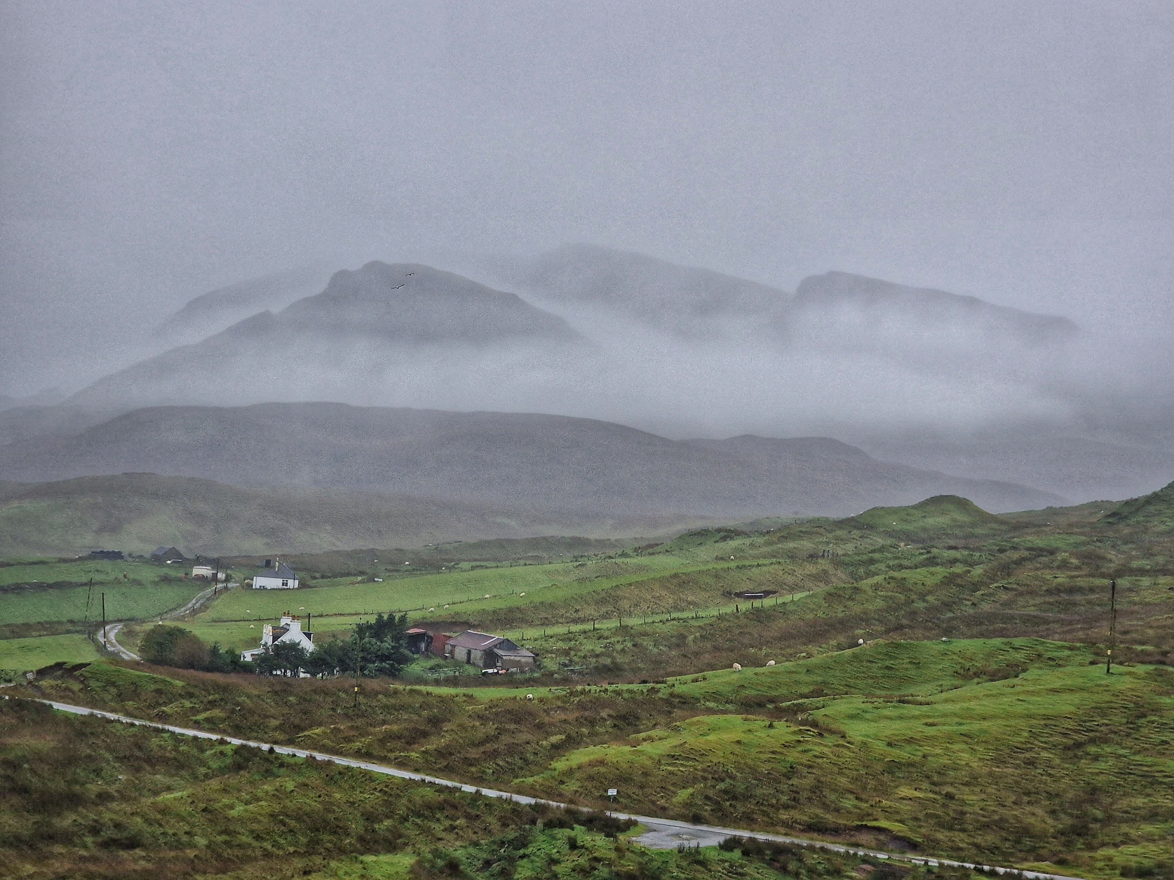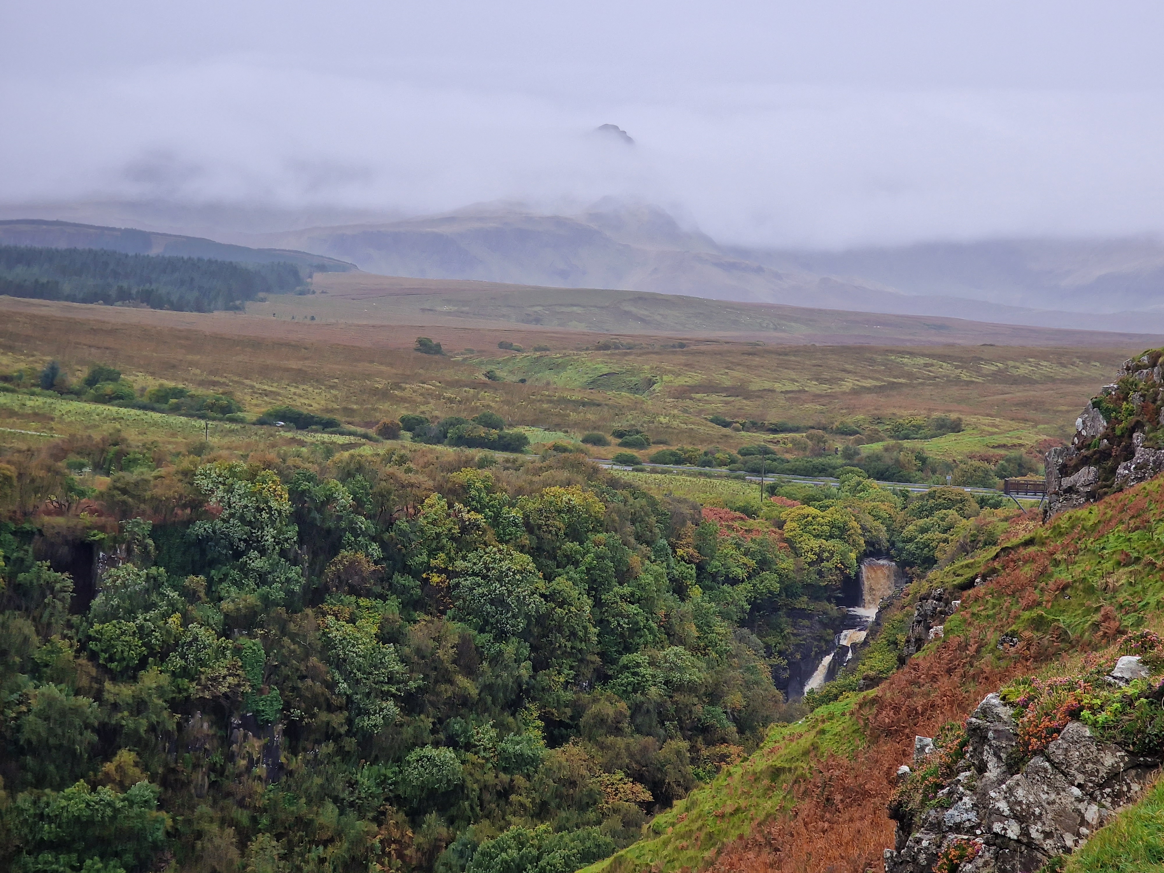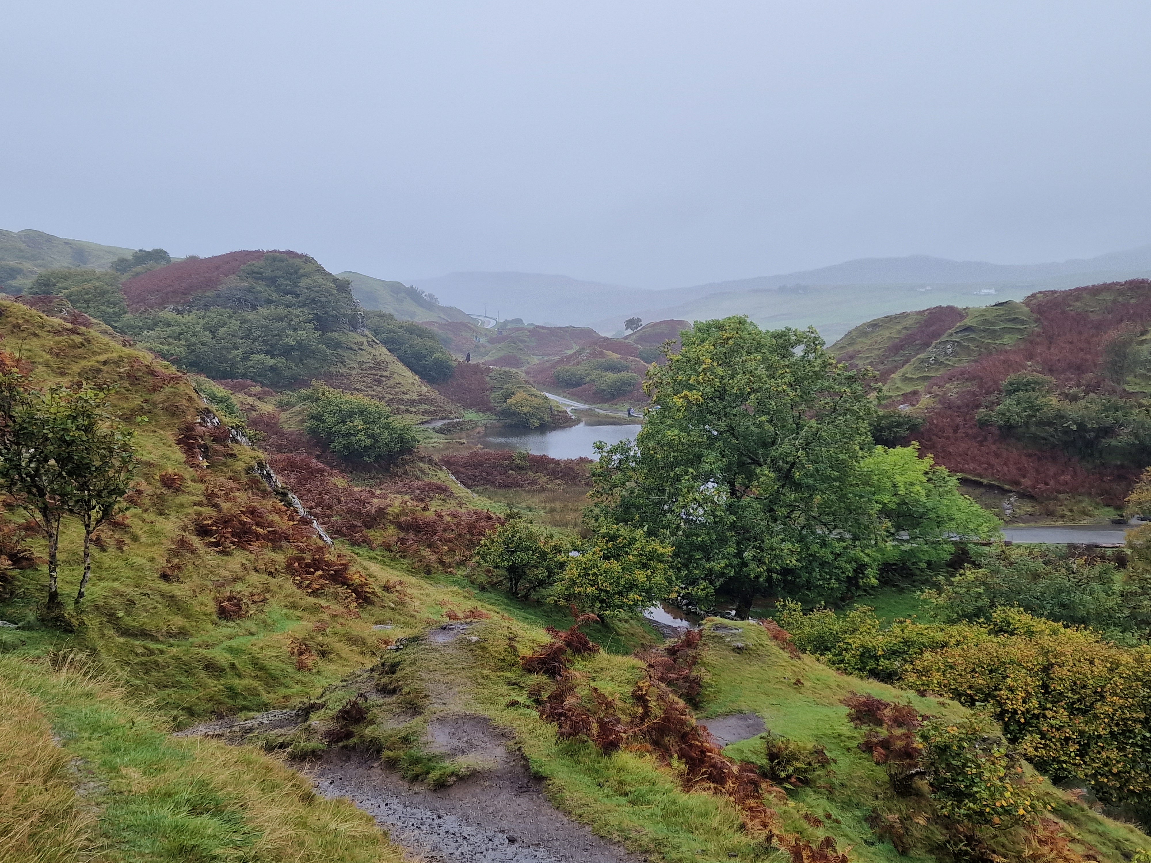 The Quiraing This was meant to be one of the hikes we did, however today the weather was even worse than yesterday. Due to the uneven ground and steep sections, a lot of reviews on AllTrails (and other websites) suggested that you don’t attempt this in adverse weather unless an experienced hiker. So… as we are absolutely not that, we thought we would try the viewpoint instead. This is one of the most photographed places on Skye, but unfortunately we just didn’t have luck on our side, and by this point, a small stream was also forming on the roads. Instead, we got a coffee and a bacon roll from the van at the car park (we were his first customer) whacked the heating on, and gave up on waiting for any of it to pass.
