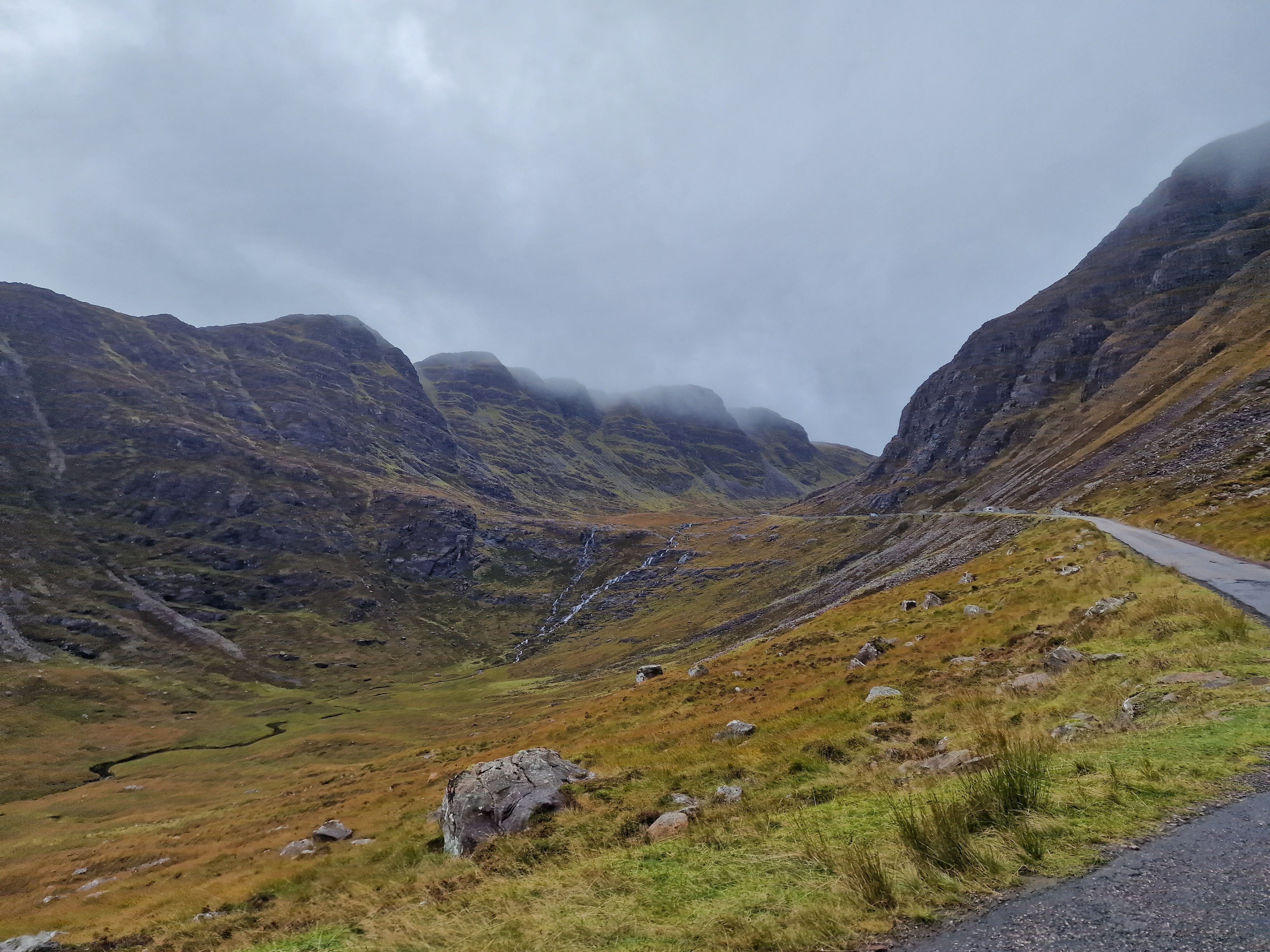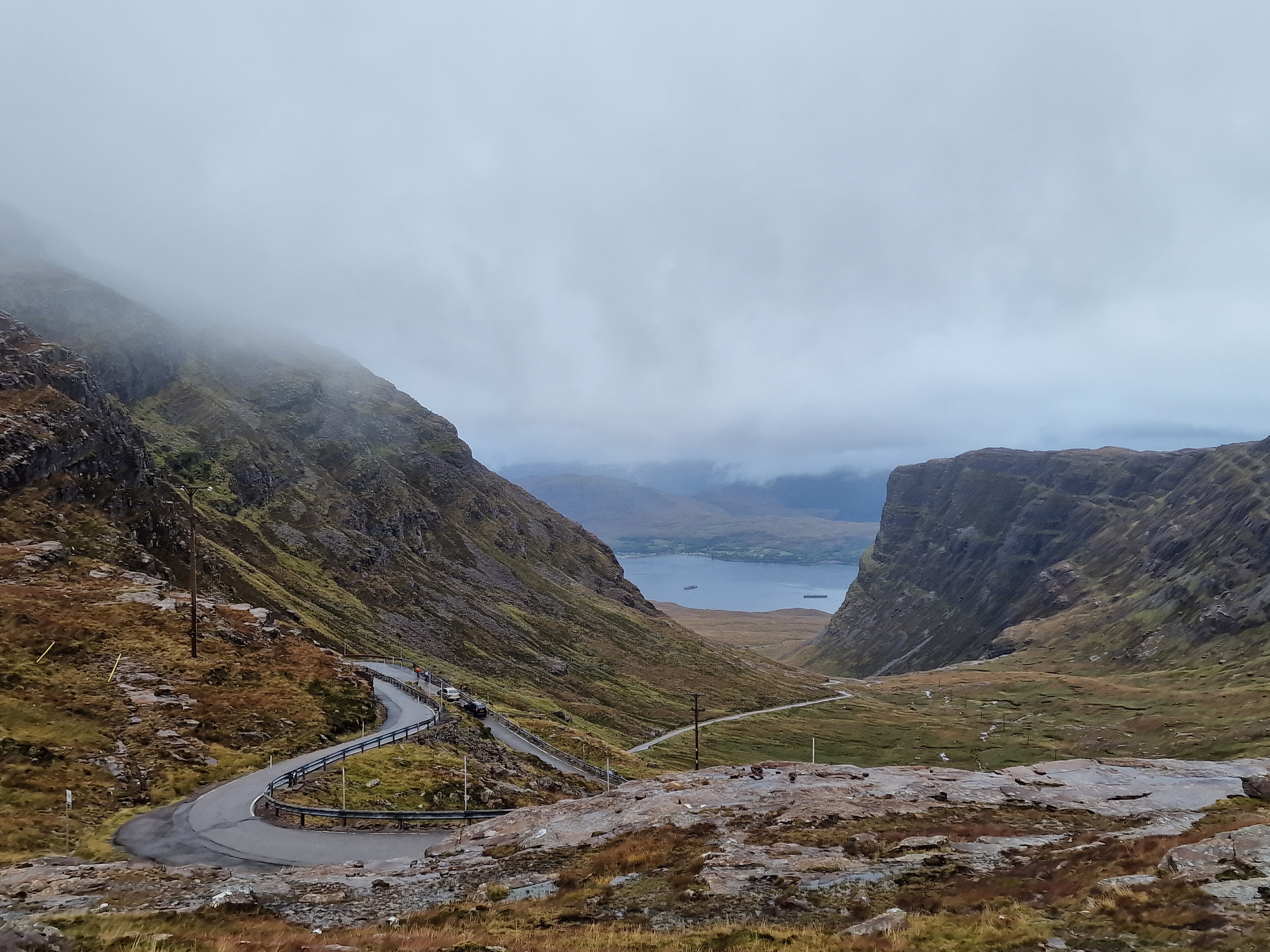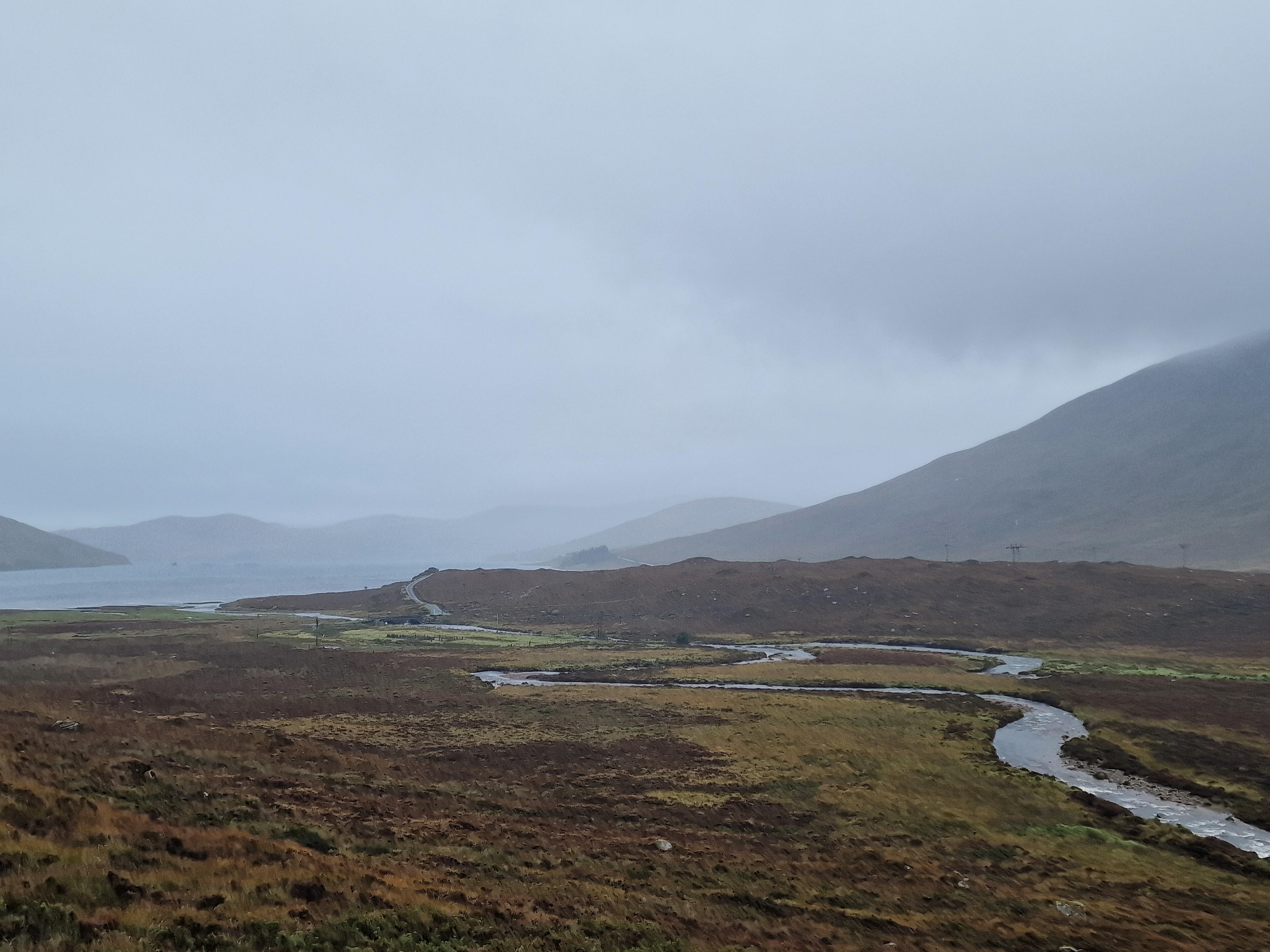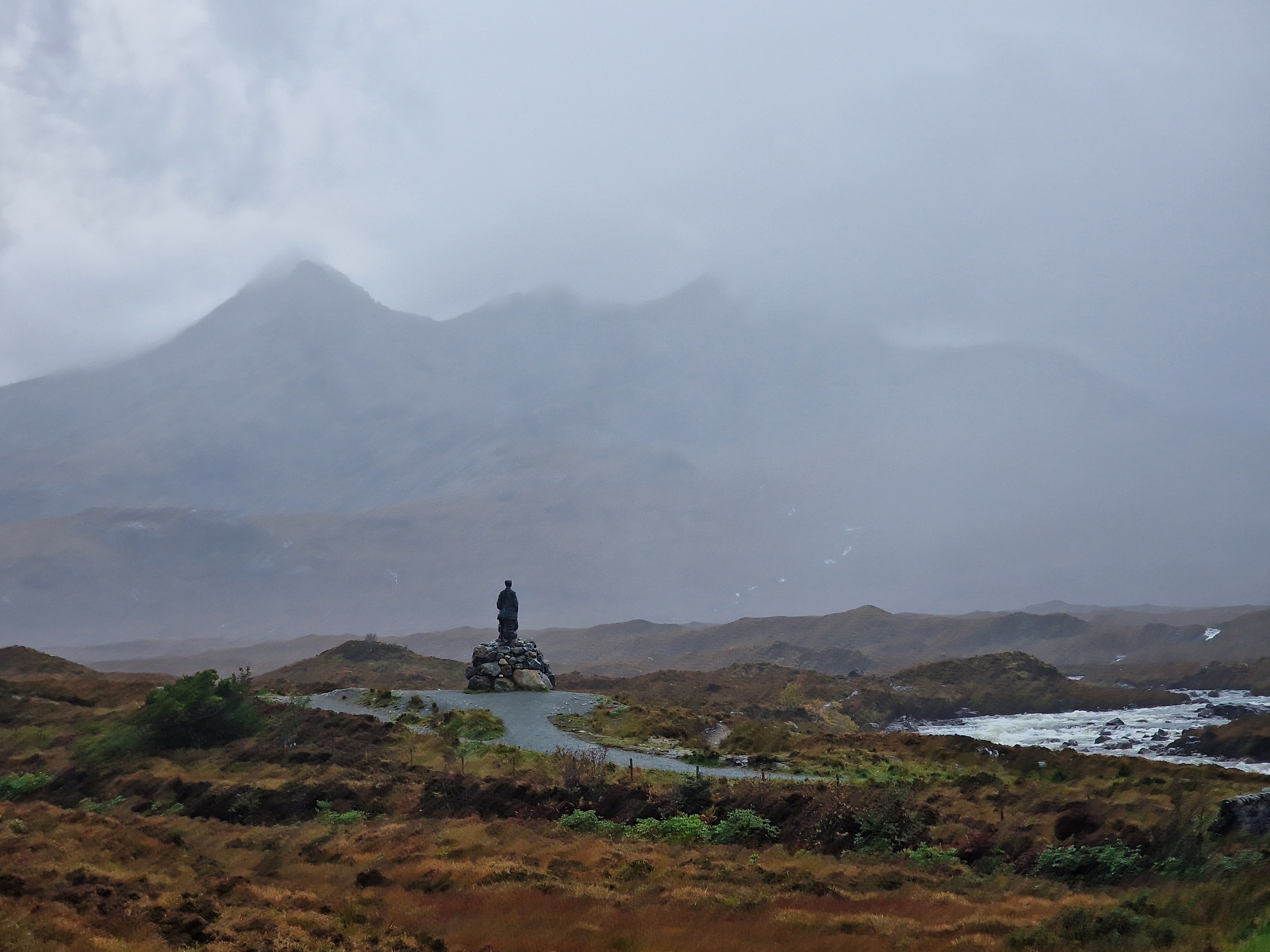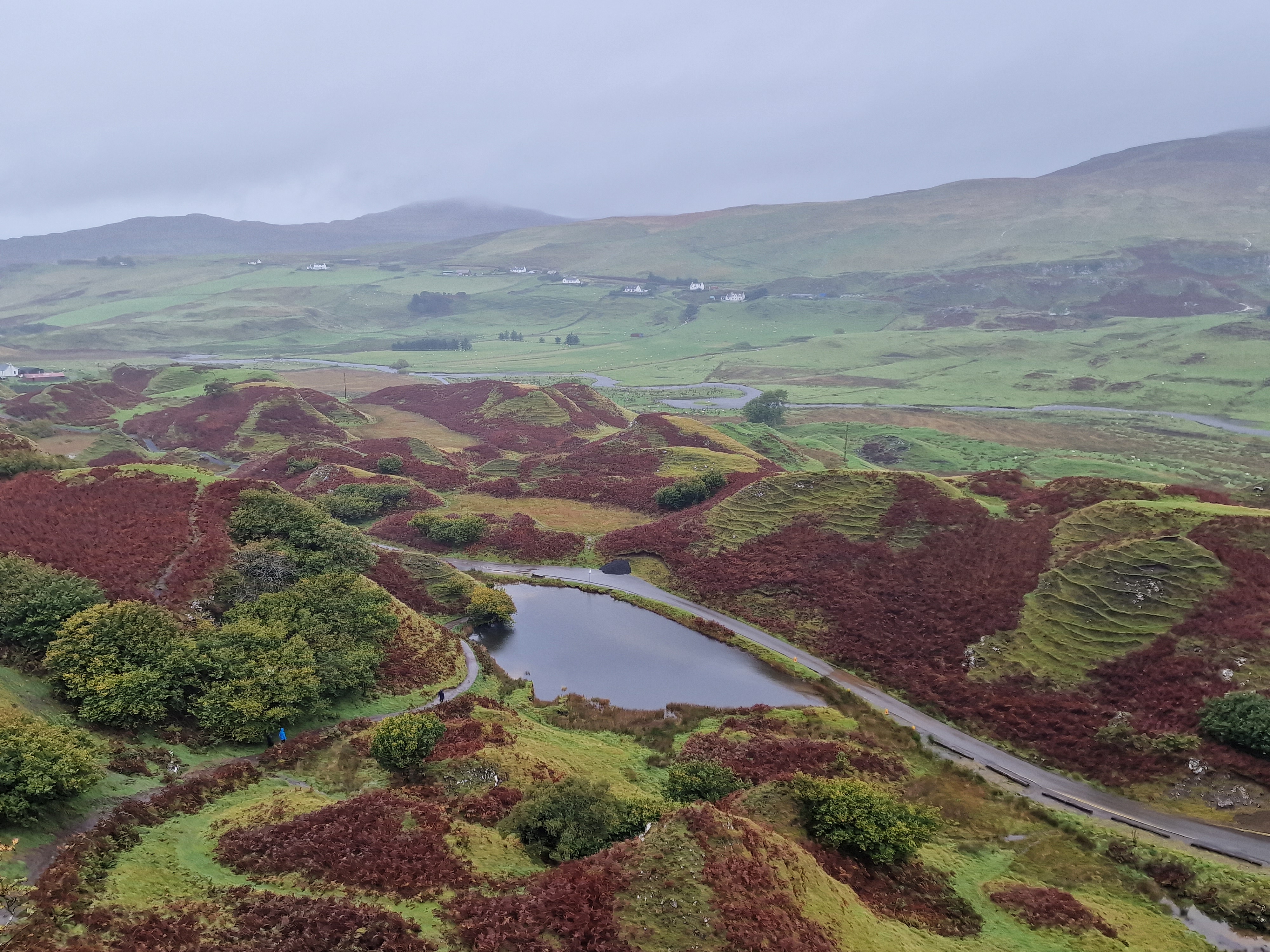 The Quiraing This was meant to be one of the hikes we did, however today the weather was even worse than yesterday. Due to the uneven ground and steep sections, a lot of reviews on AllTrails (and other websites) suggested that you don’t attempt this in adverse weather unless an experienced hiker. So… as we are absolutely not that, we thought we would try the viewpoint instead. This is one of the most photographed places on Skye, but unfortunately we just didn’t have luck on our side, and by this point, a small stream was also forming on the roads. Instead, we got a coffee and a bacon roll from the van at the car park (we were his first customer) whacked the heating on, and gave up on waiting for any of it to pass.