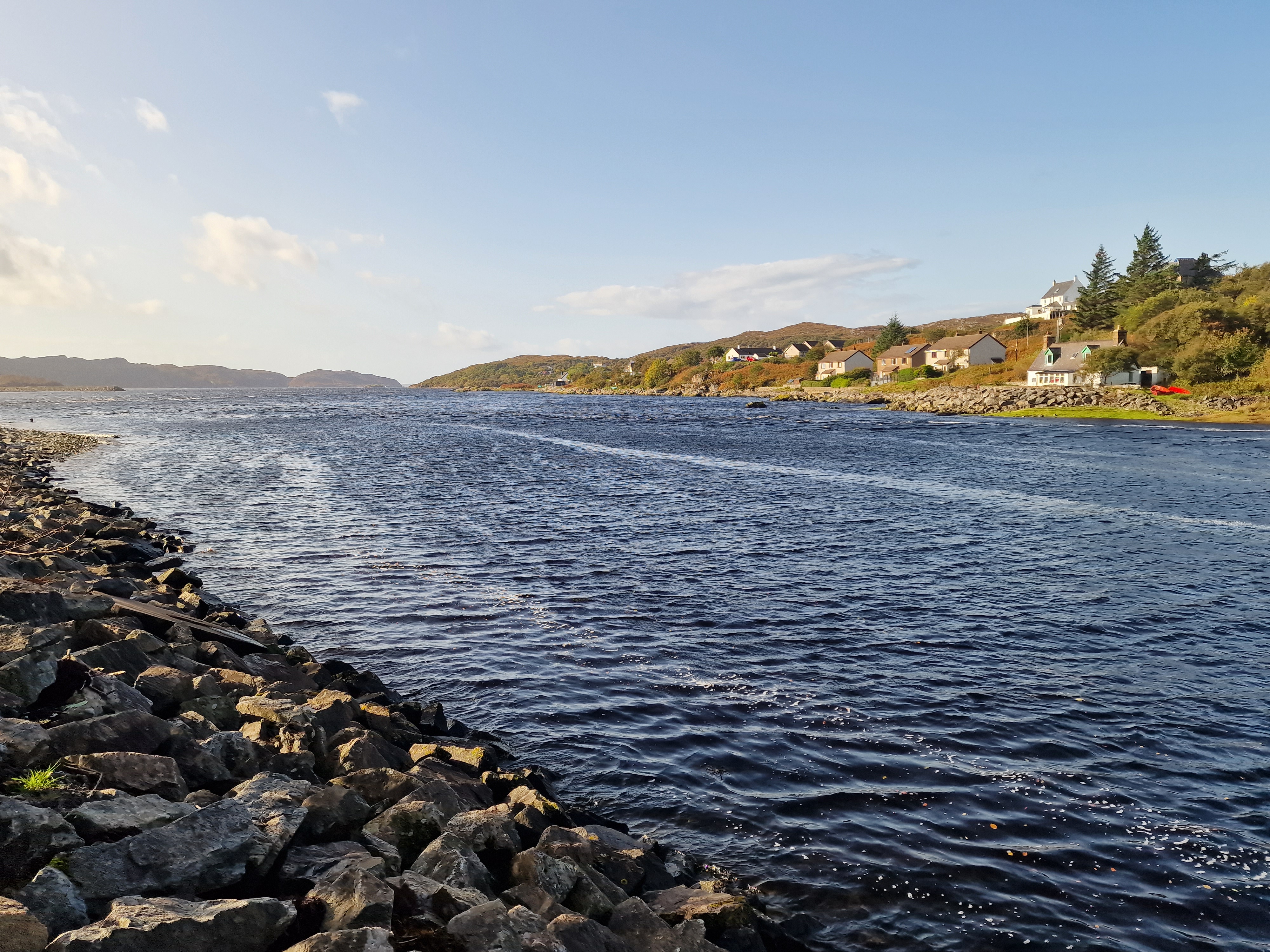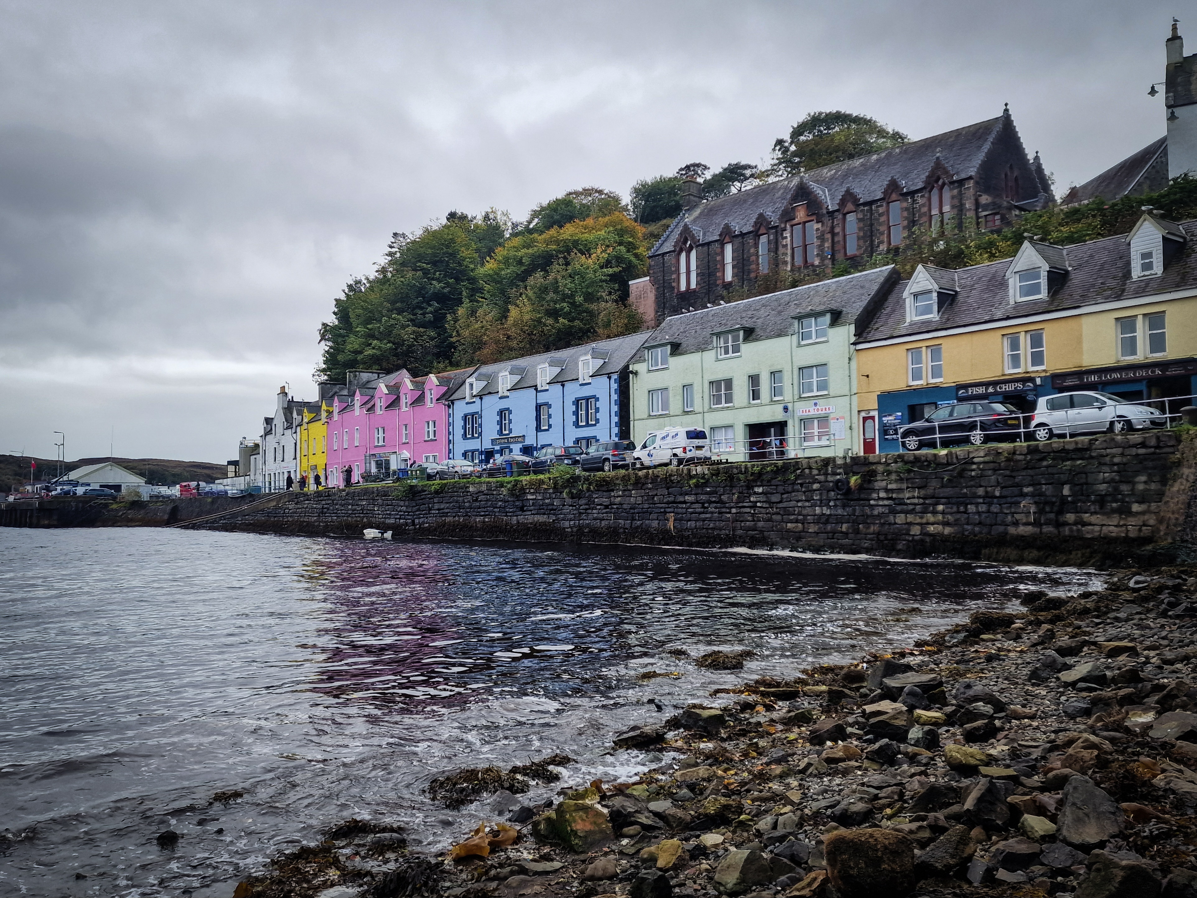 Portree As with everywhere we have been so far, there are plenty of places to pull over for a view and a quick photo. We spotted a waterfall and P, so we parked up, and I popped over the road for a closer look. Unfortunately, there was a large family who had got there first. They started by all having individual photos, then various group photos.. they were completely oblivious that others were trying to admire/photograph the falls. I got fed up waiting, so I took a photo, edited them out, and went back to the van to continue the journey. Portree is the colourful capital of the Isle of Skye and is a lovely little seaside town. It’s full of cafés, bars, restaurants, gift shops and of course, whisky shops. A trip here wouldn’t be complete without a visit to the viewpoint for the multicoloured houses or a walk around the harbour to see them up close. On a nice day, there are plenty of cafés to choose from to sit back and watch the boats bobbing on the Loch with the stretch of hills in the background.