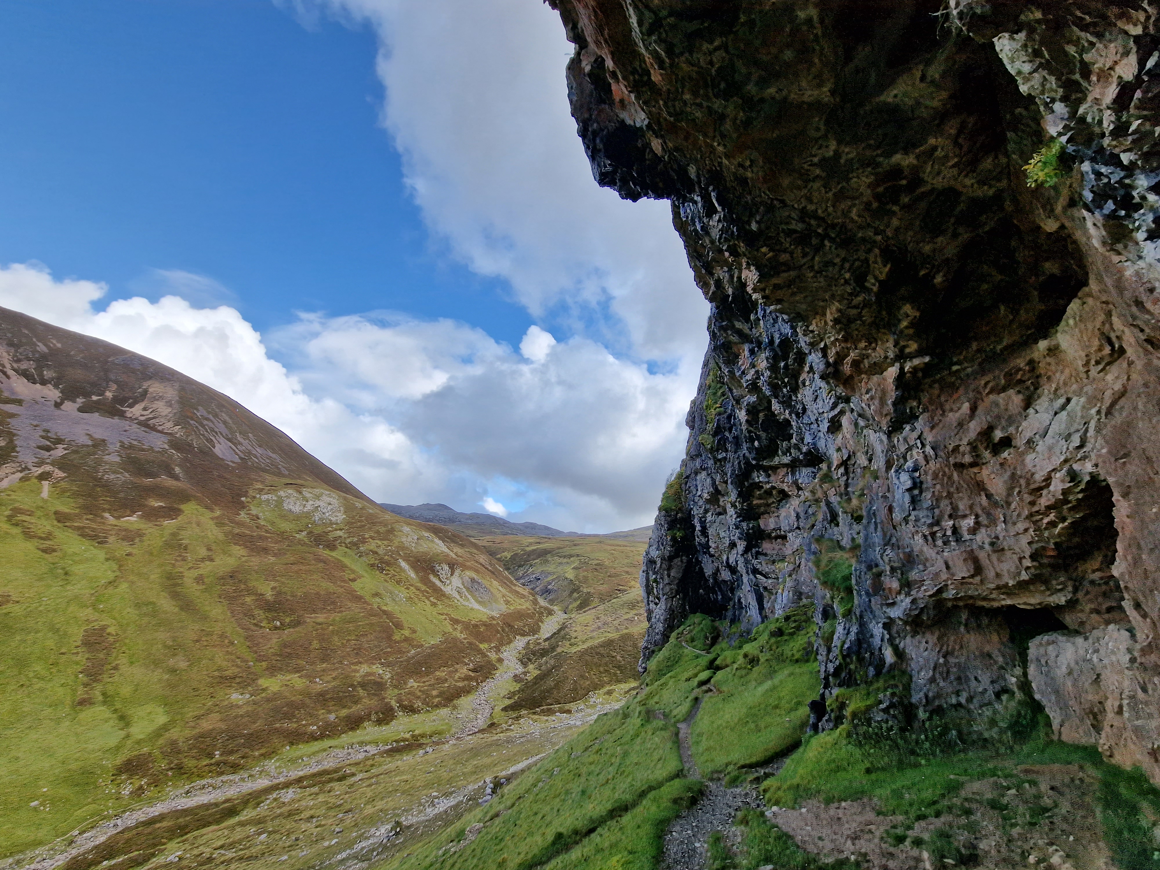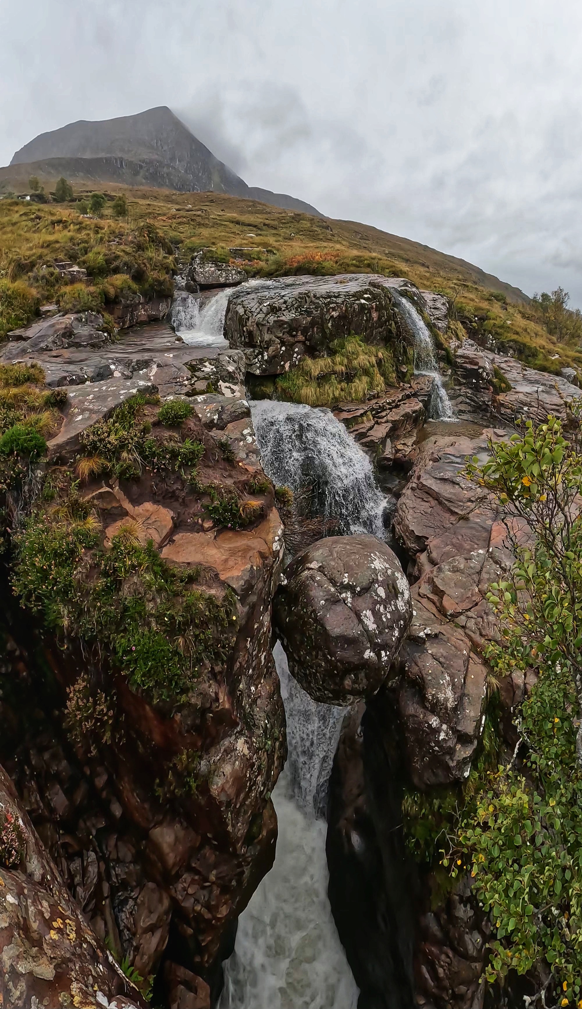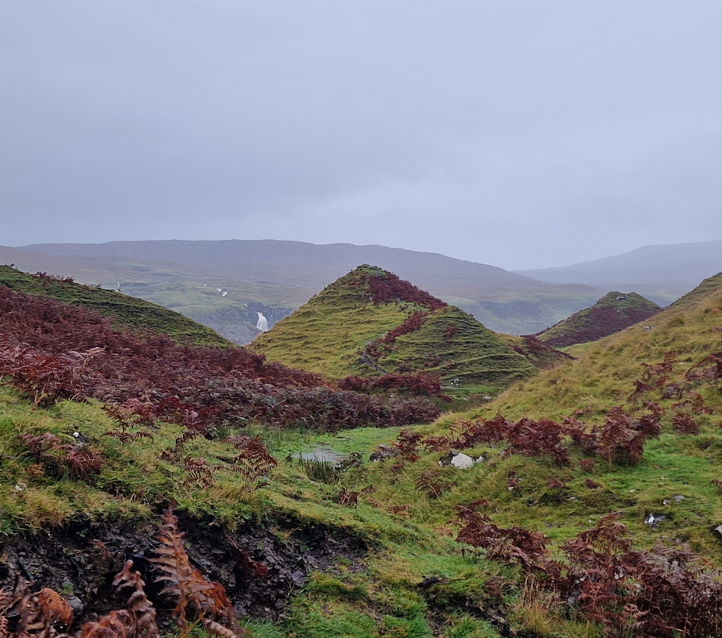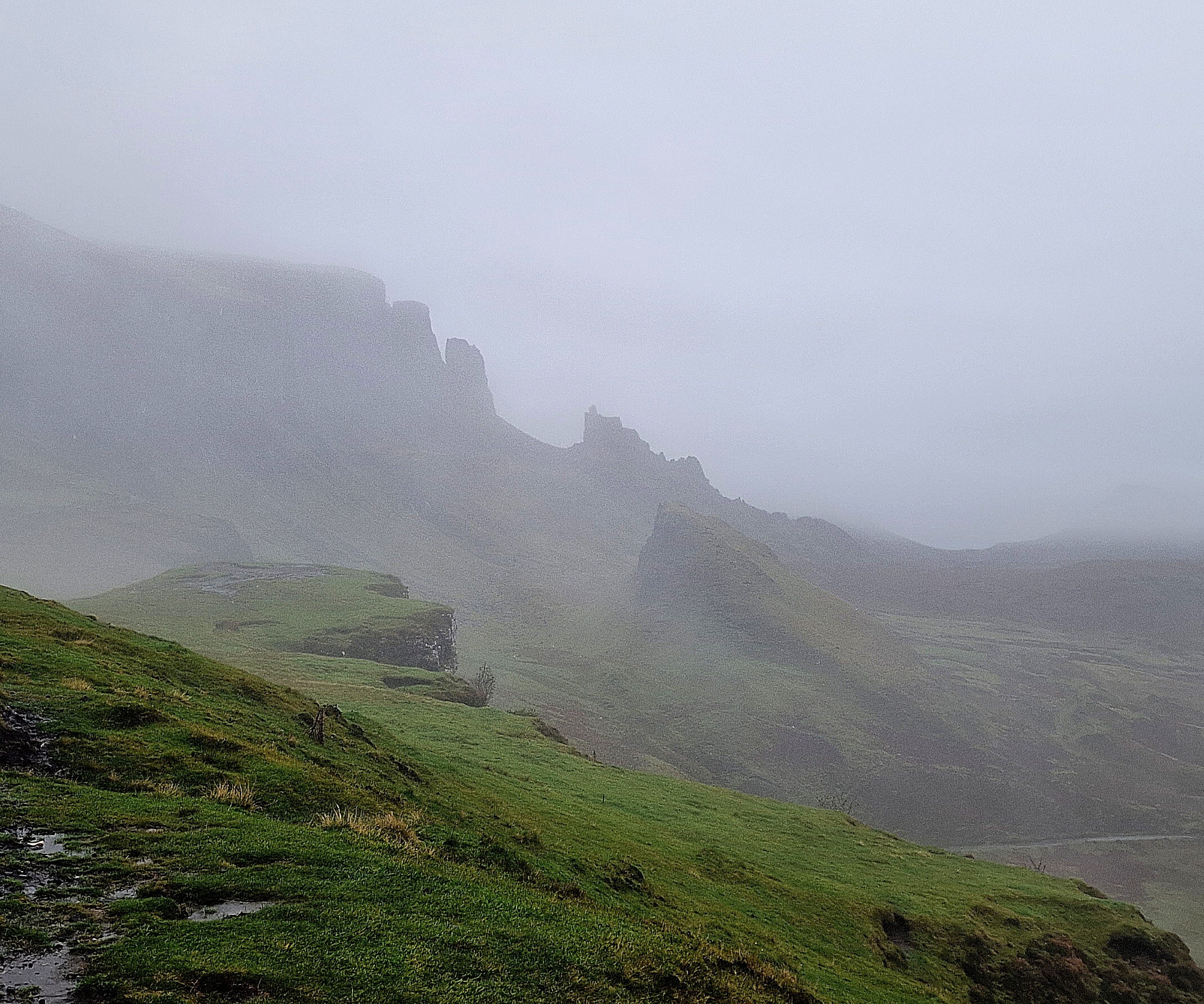 Fairy Glen A delightful and enchanting miniature landscape of grassy, cone-shaped hills. The Isle of Skye is rich with faerie lore, however, the unique geological formations here are actually the result of a landslip (but dont think about that, let your imagination go wild). This is very easily accessible, with lots of parking and the whole area is a lovely walk. There is a large rock formation in the middle, known as Castle Ewen, which you can climb up for views across the whole site. Unfortunately, we chose to do it whilst it was quite busy, and I got wedged in the tiny gap used to get up to the top. Conscious that people were trying to get up and down, I managed to unwedge myself, but gave up giving it another attempt. We spent a bit of time exploring the area, but as the rain continued, the ground just became too boggy to enjoy it anymore. Luckily, everyone had decided to leave, so I gave Castle Ewen one more try, and with a bit of manoeuvre, managed to make it to the top.
