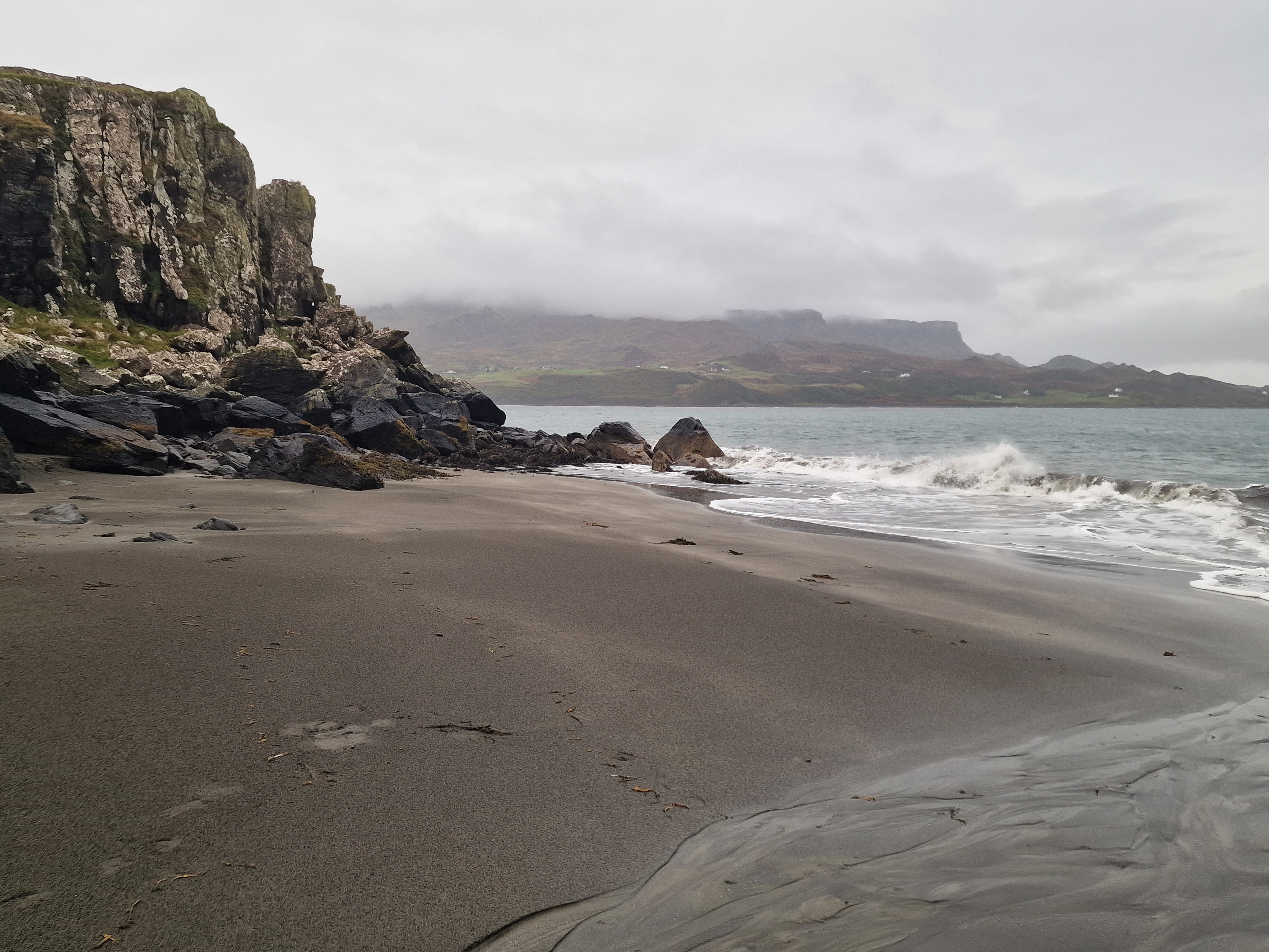 Staffin As mentioned in the previous blog, there aren’t many campsite options this late in the season. But we found a small one in Staffin, which is located near to the dinosaur beach. By now the rain was heavy, but I was determined to find the dinosaur footprints which are located on various rocks around this black sand beach. We hunted for them, but soon gave up, which by the looks of it, so did a lot of people judging by the amount of footprints drawn in the sand instead. On a clear day, the Quiraing dominates the skyline here, so if you are fortunate with the weather, you should definitely add this beach to your list. The campsite for the night was small and settled, but despite multiple signs saying do not dry clothes using hand dryers and hair dryers, people were drying their clothes with hand dryers and hair dryers.