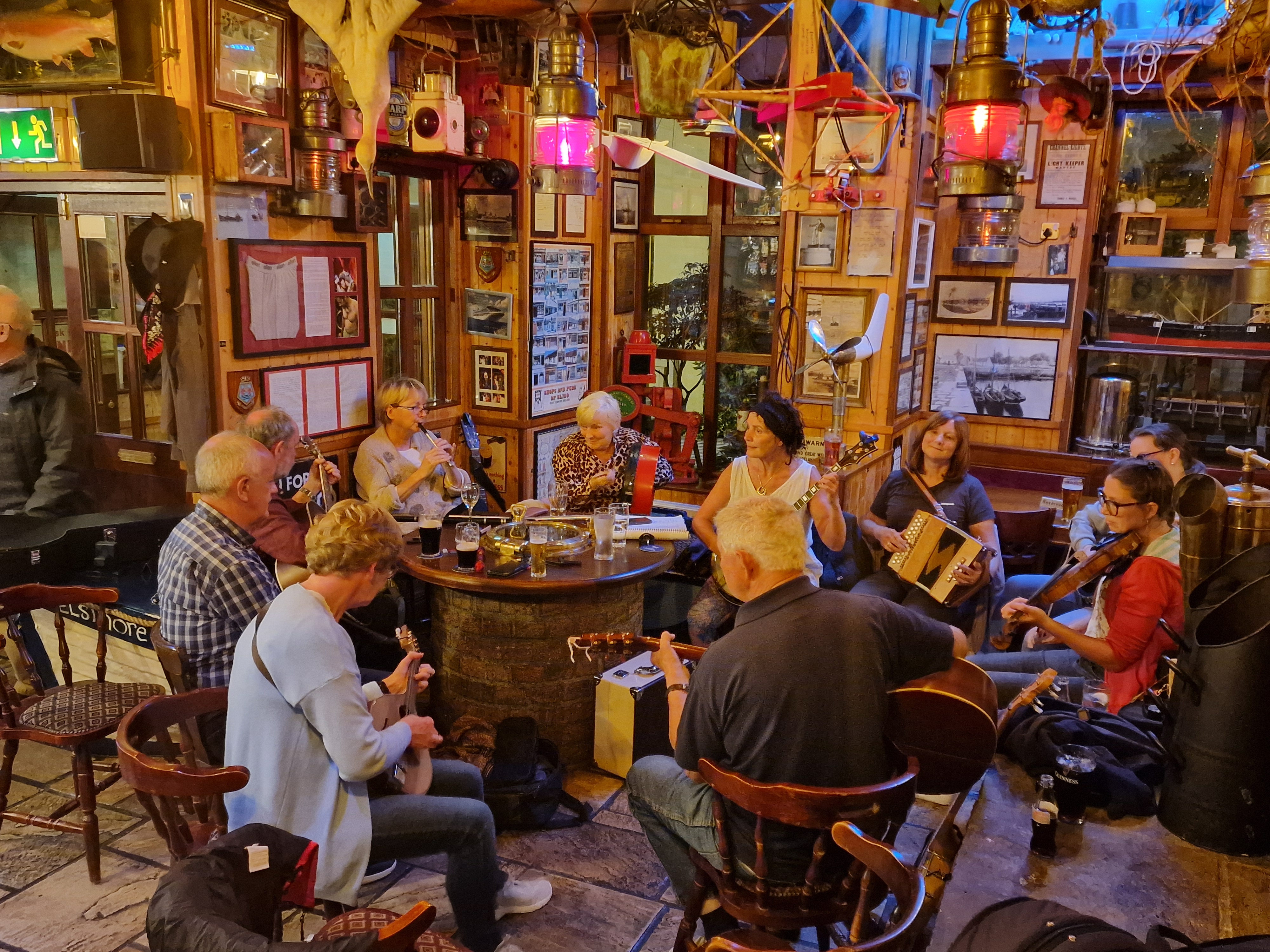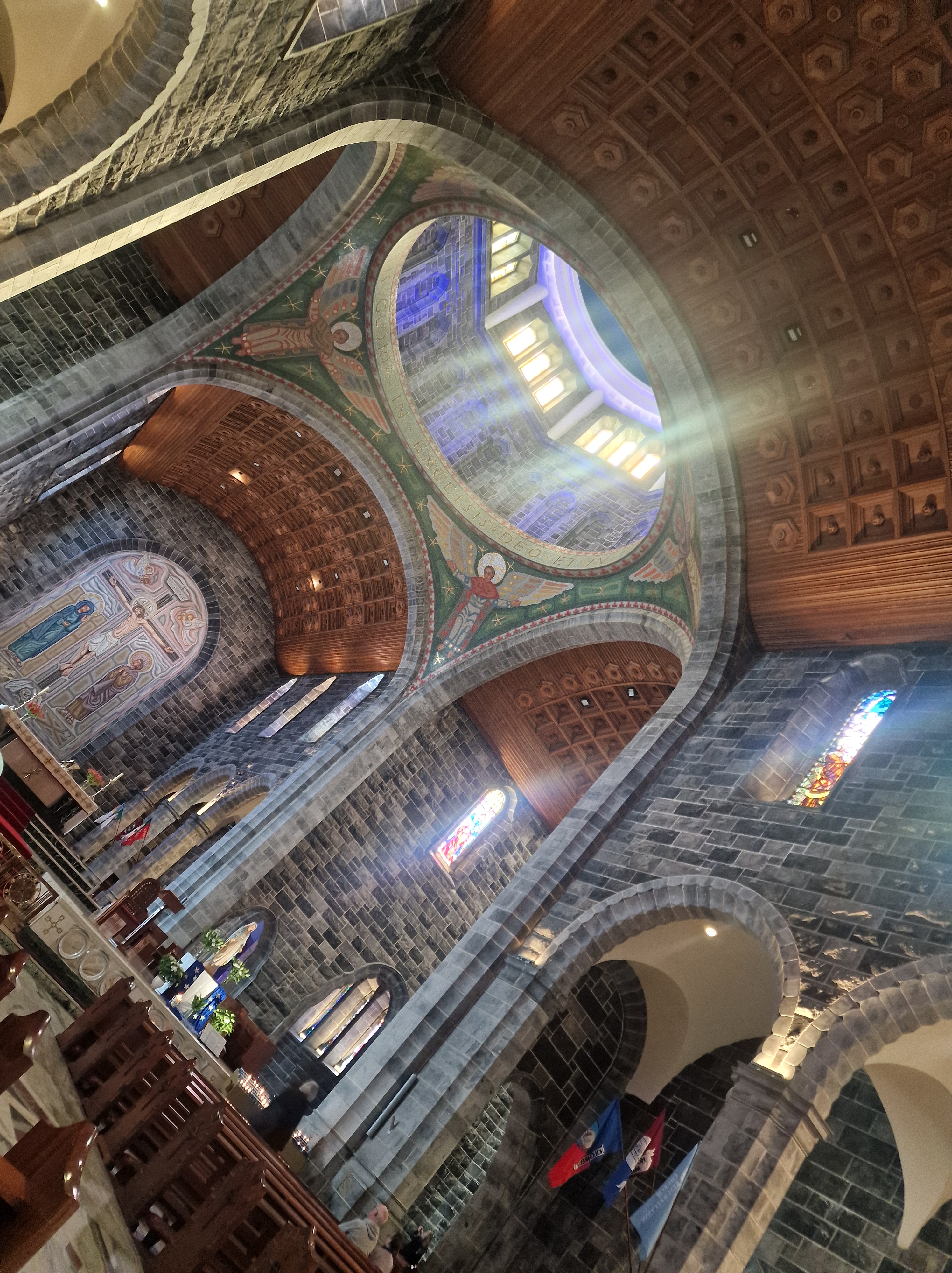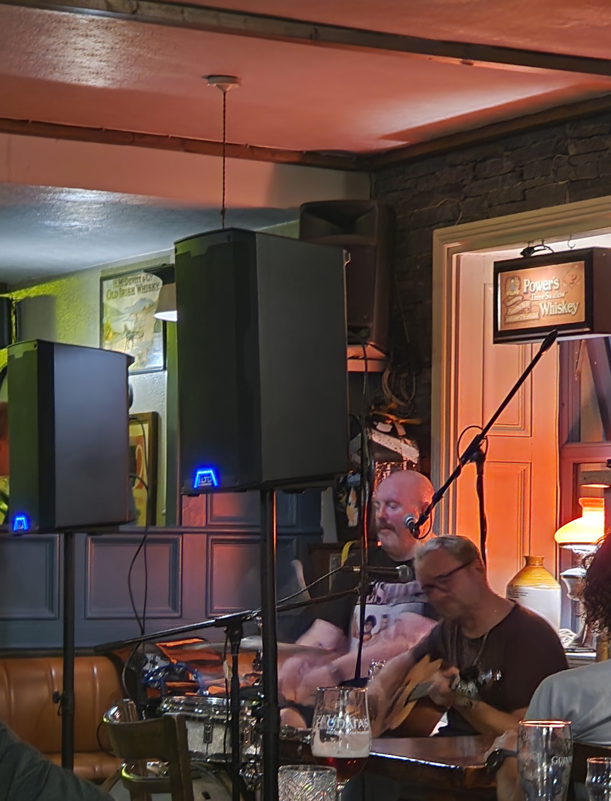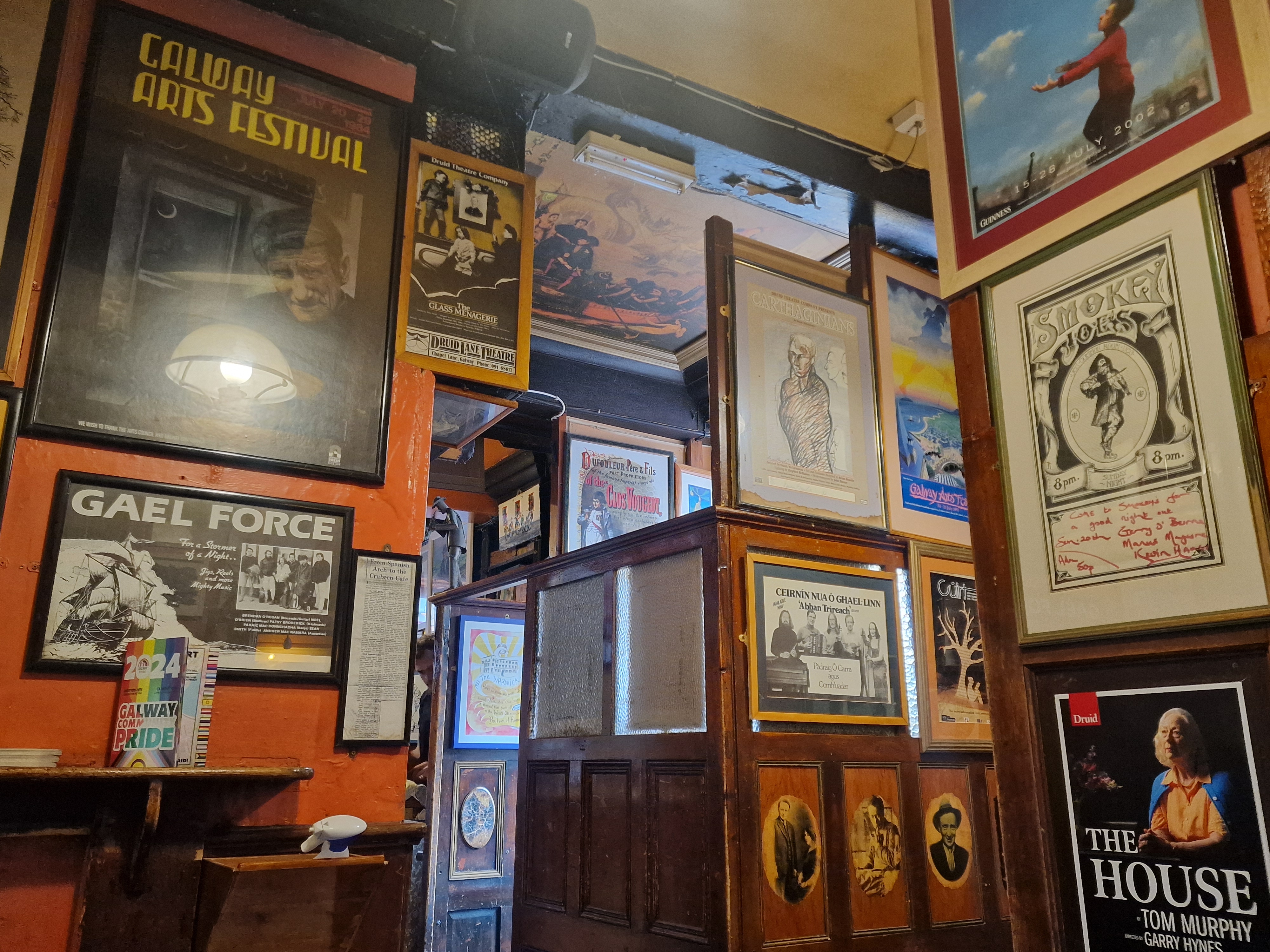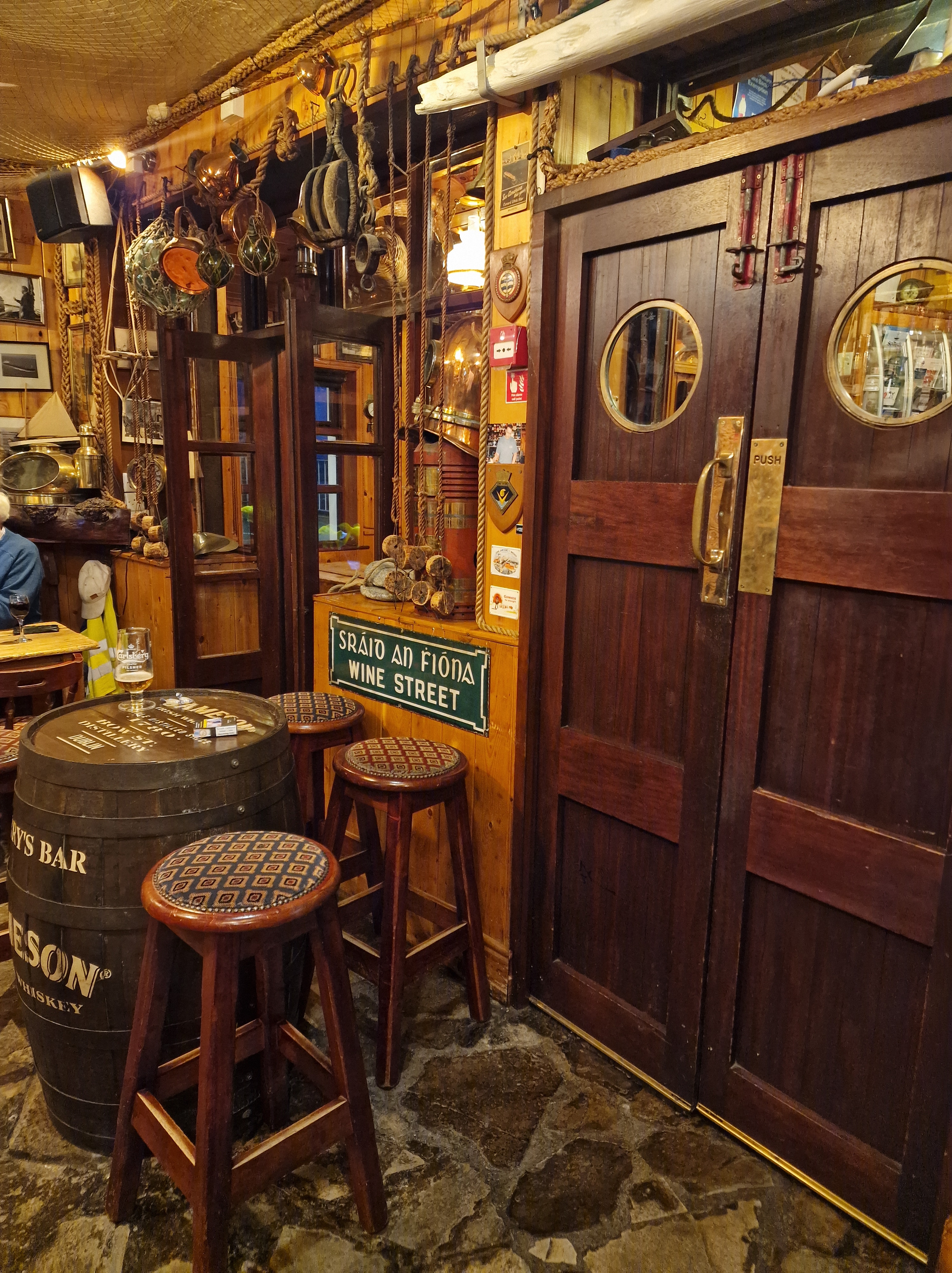 a visit to see the stained glass and mosaics. Feeling peckish after our visit, we stumbled upon a deli that sold the most delicious sandwiches. We decided to sit in their restaurant upstairs to enjoy our meal, but unfortunately, a few rouge wasps were buzzing around which made the experience less enjoyable for Mark. We were eager to have a drink in one of the traditional pubs, and after listening to some street buskers, we found the pub recommended by Nicola Coughlan (Penelope in Bridgerton). It was bustling with a cool vibe, featuring lots of quirky artwork, and both locals and tourists were enjoying the drinks the pub had to offer.