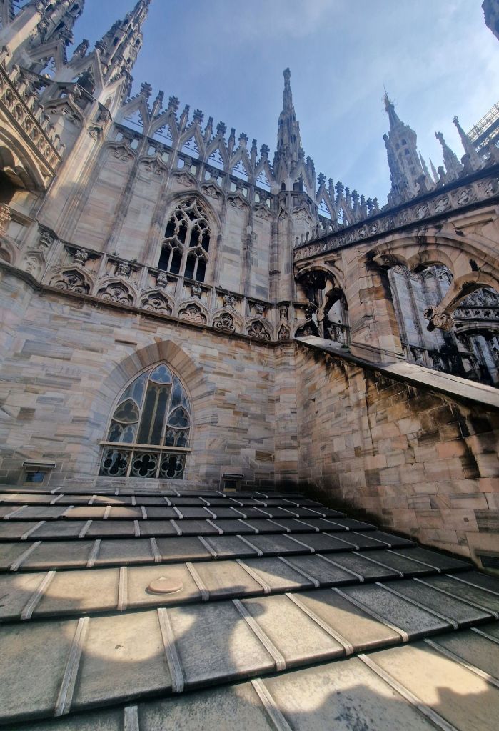 We joined the bag search queue for the Duomo, where the security man decided to accuse Momma of carrying a knife.. and spent an incredibly long time meticulously searching her bag. Once he was satisfied that she wasn’t a potential criminal (it was actually the huge metal keyring attached to the apartment key.. and all fairness could be used as a weapon) he let us go up to the terraces of the Duomo.