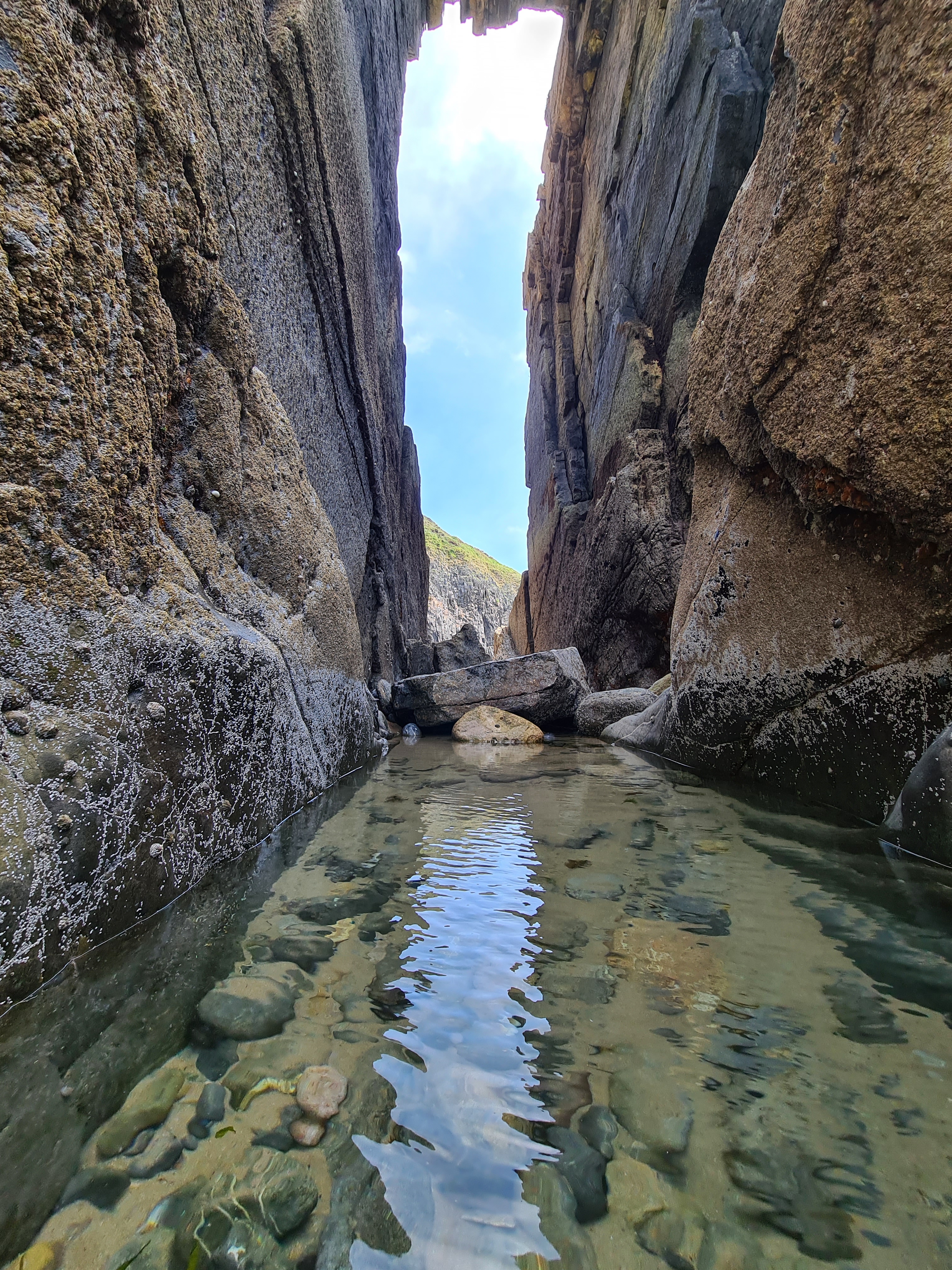 As we strolled across the beach and ventured through the triangular gap in the rock, we remained mindful of the tide gradually coming in.